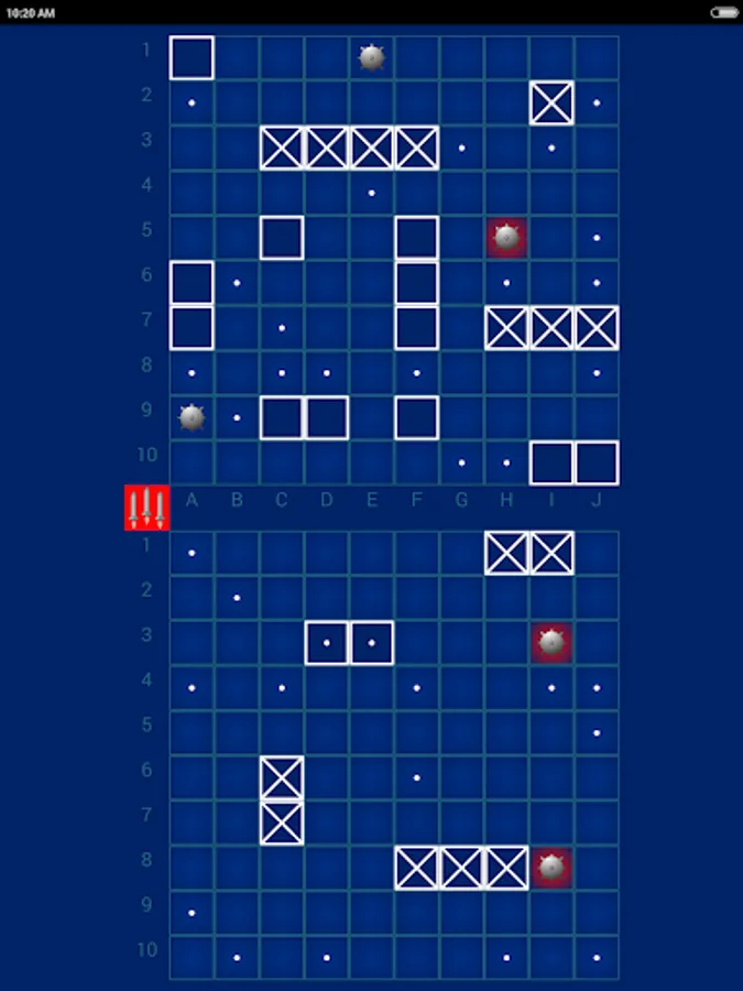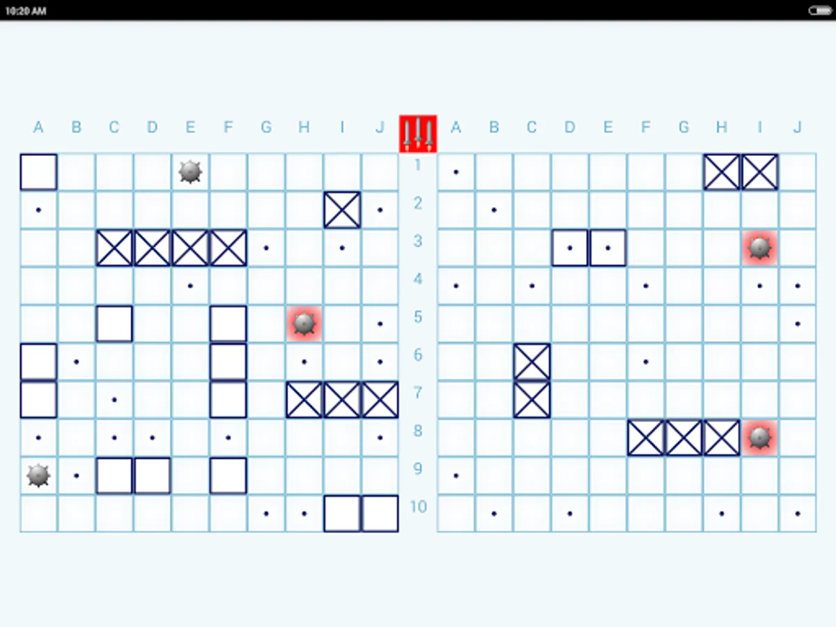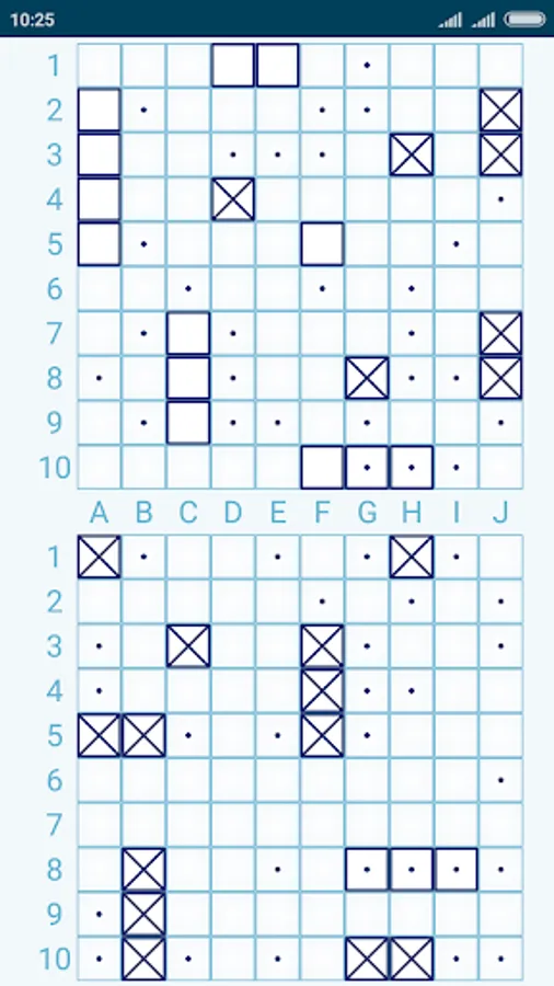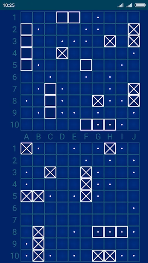 The game screen of the application consists of two playing fields - the enemy and yours. Each field consists of 100 cells: 10 horizontally and 10 vertically. For convenience, cells are indicated horizontally by letters, and vertically by numbers, for example: A1, E7, J10.