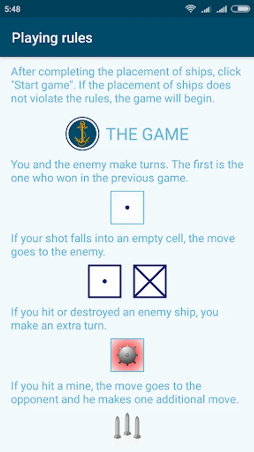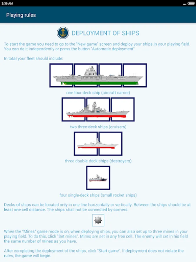 When the “Mines” game mode is on, when deploying ships, you can also set up to three mines in your playing field. To do this, click "Set mines". Mines are set in any free cell. The enemy will set in his field the same number of mines as you have.