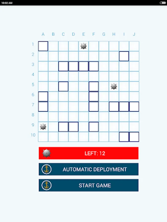 To start the game you need to go to the "New game" screen and deploy your ships in your playing field. You can do it independently or press the button "Automatic deployment".