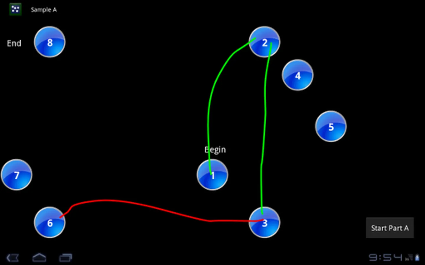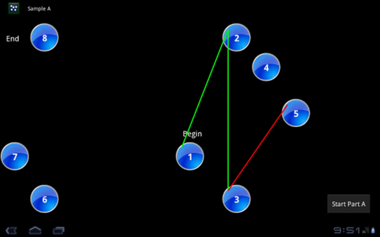 The entire procedure consists of the sample with 8 disks followed by full trial, for both Part A (circles 1 to 25) and Part B (circles 1 to 13, with numbers and letters); at the end of the procedure, you can view the participant's name and timing of tests.