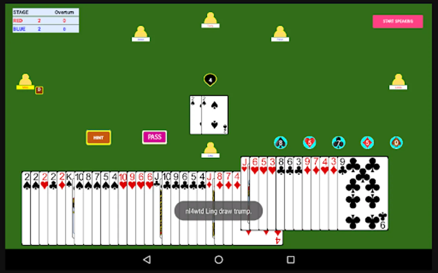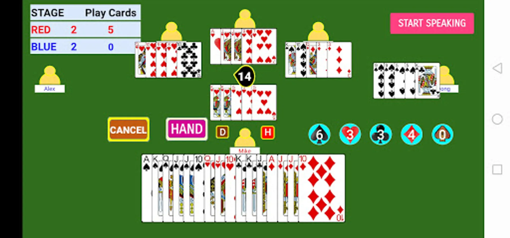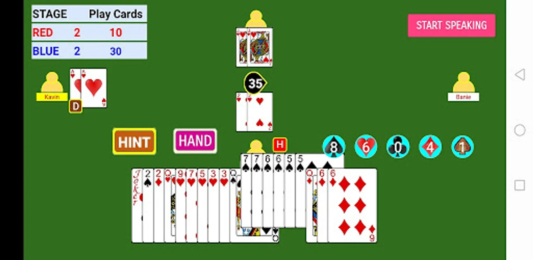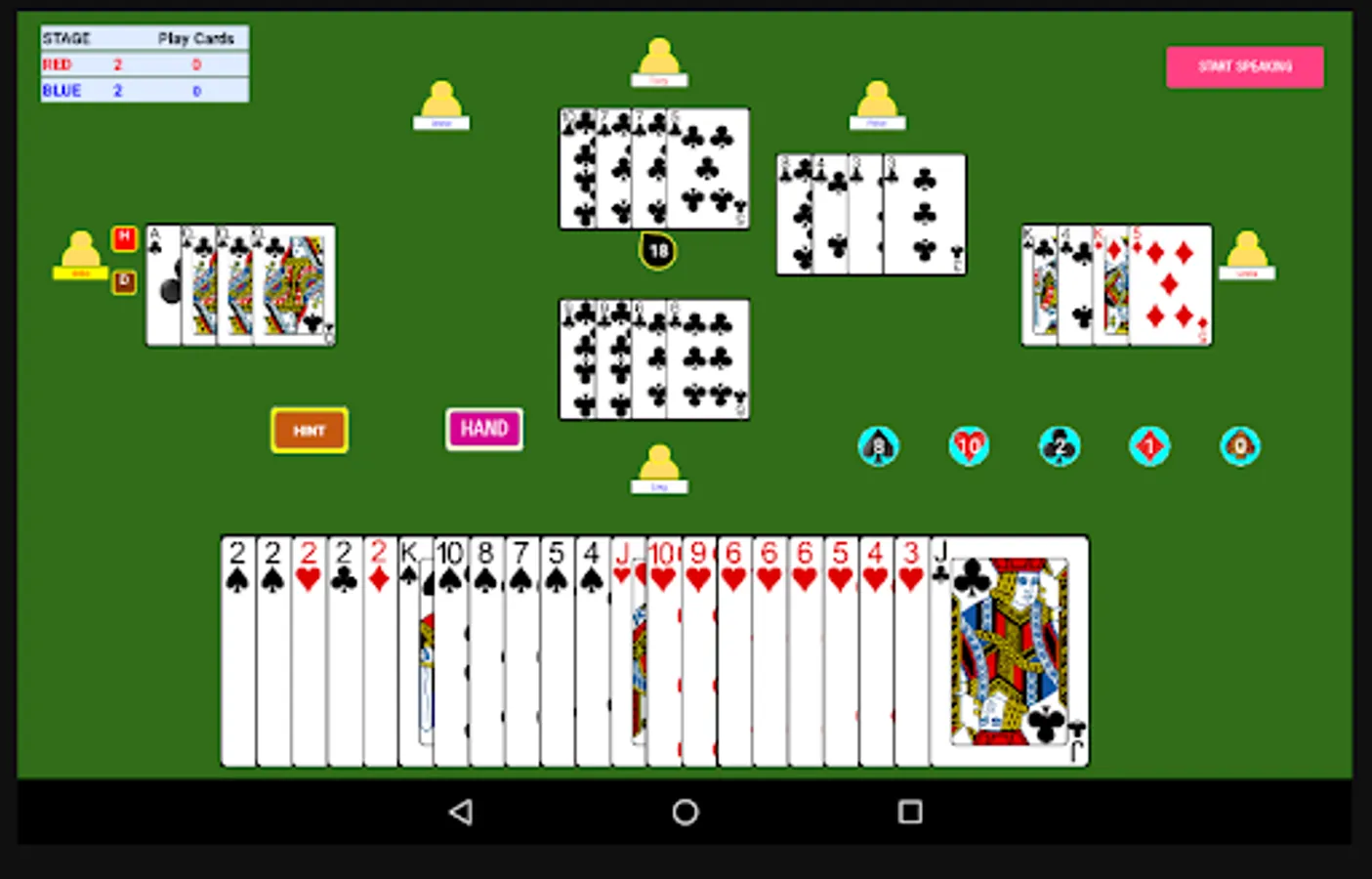 It involves 4 or 6 players, each team's goal is to get as many points as they can to level up. With our app, you are able to play with your friends or add bots to play by yourself. By using the hint button, it will be able to teach you how to play.