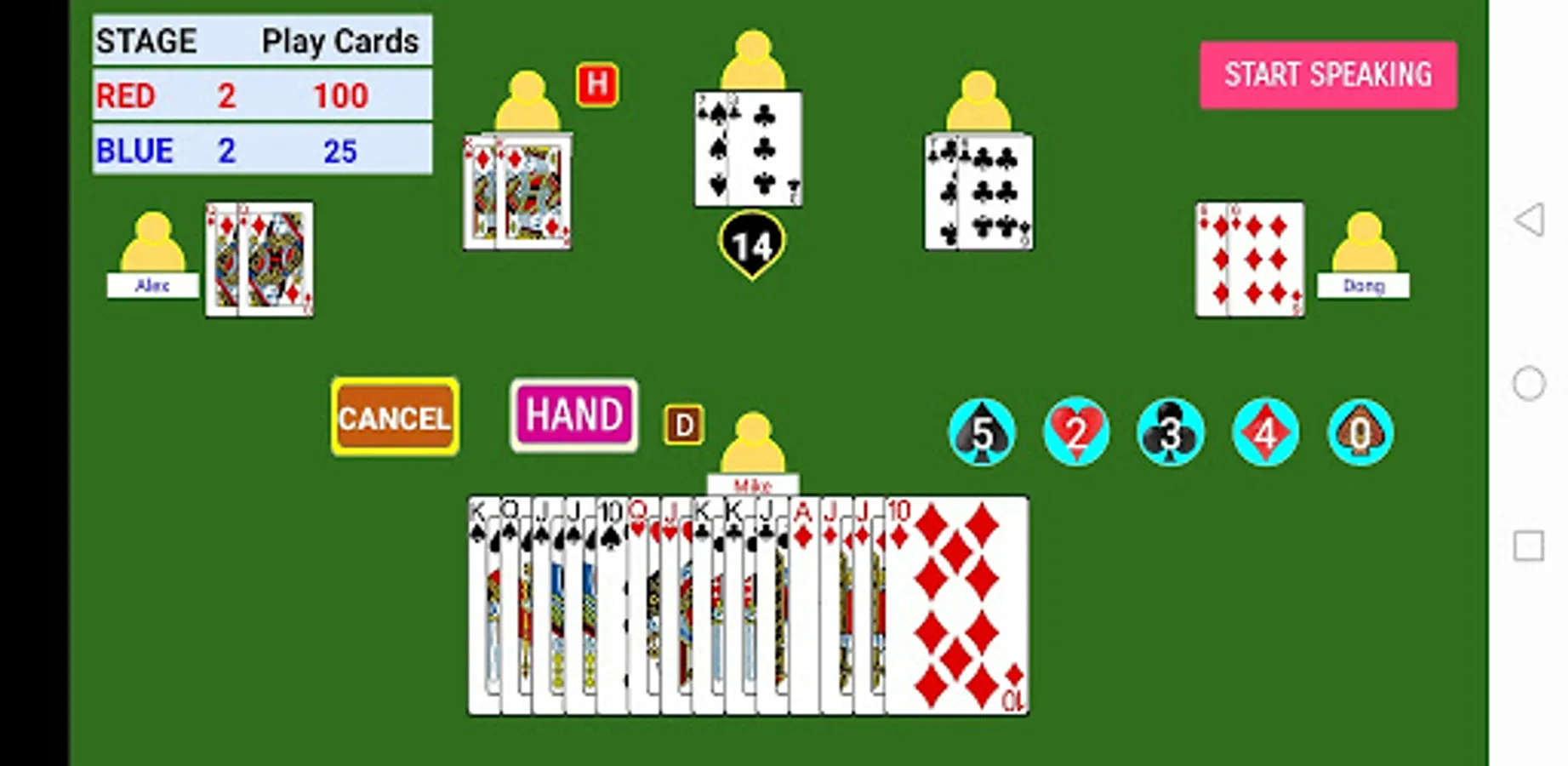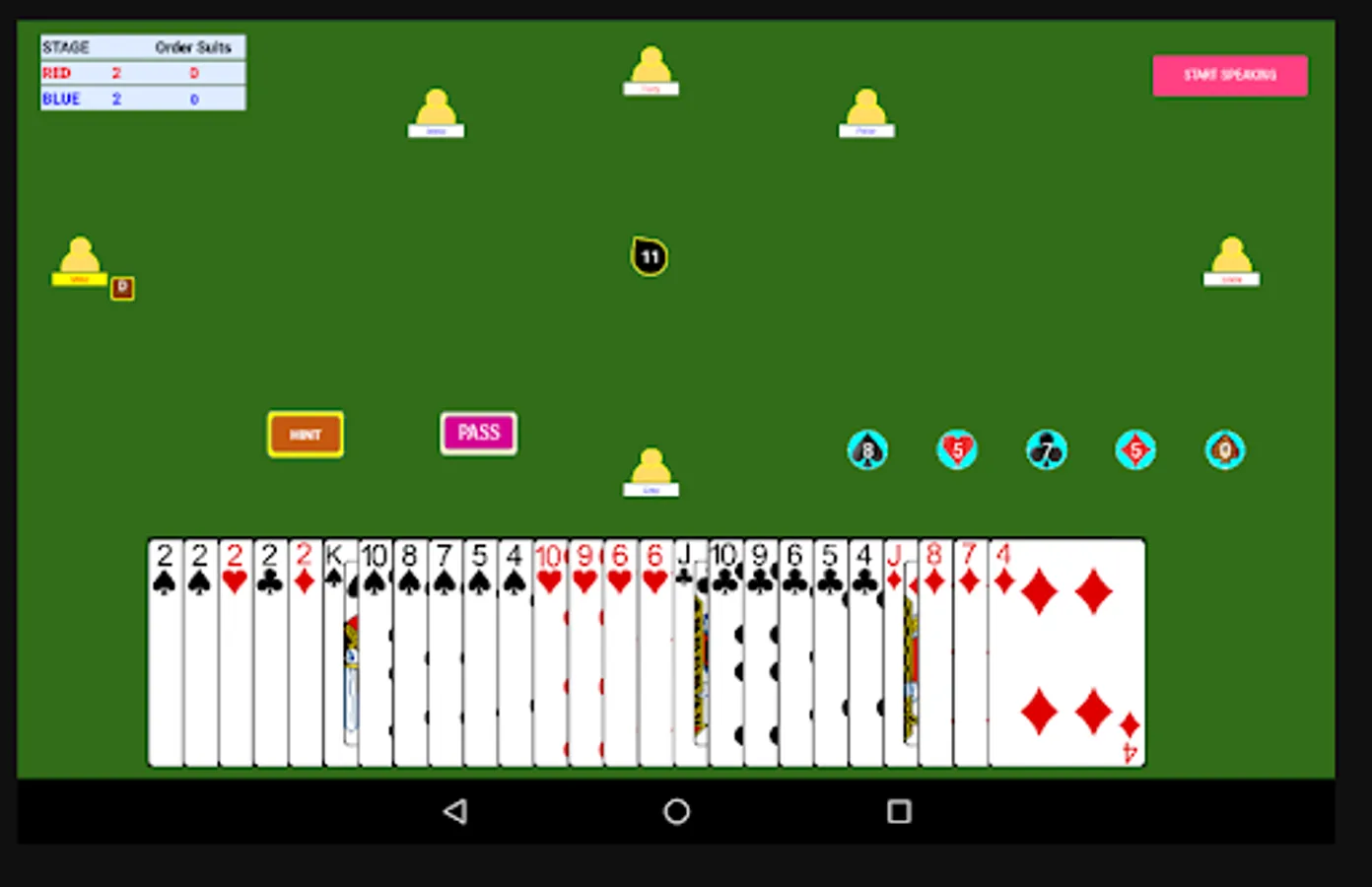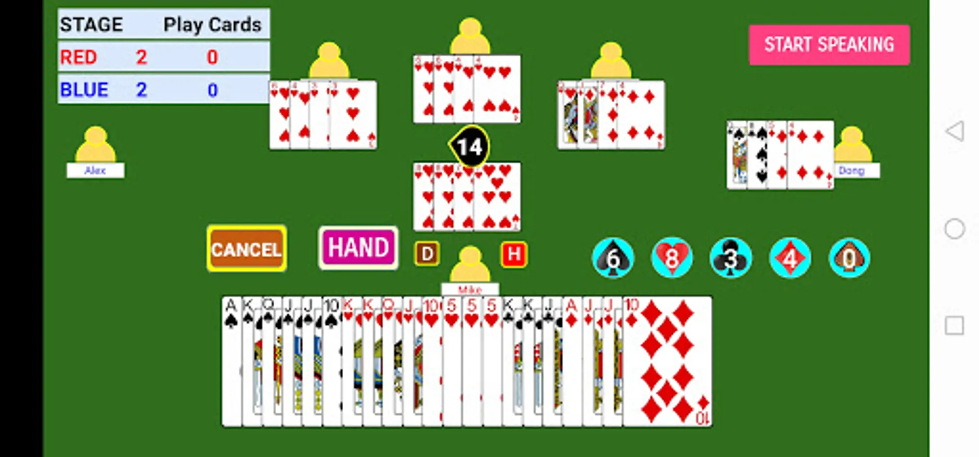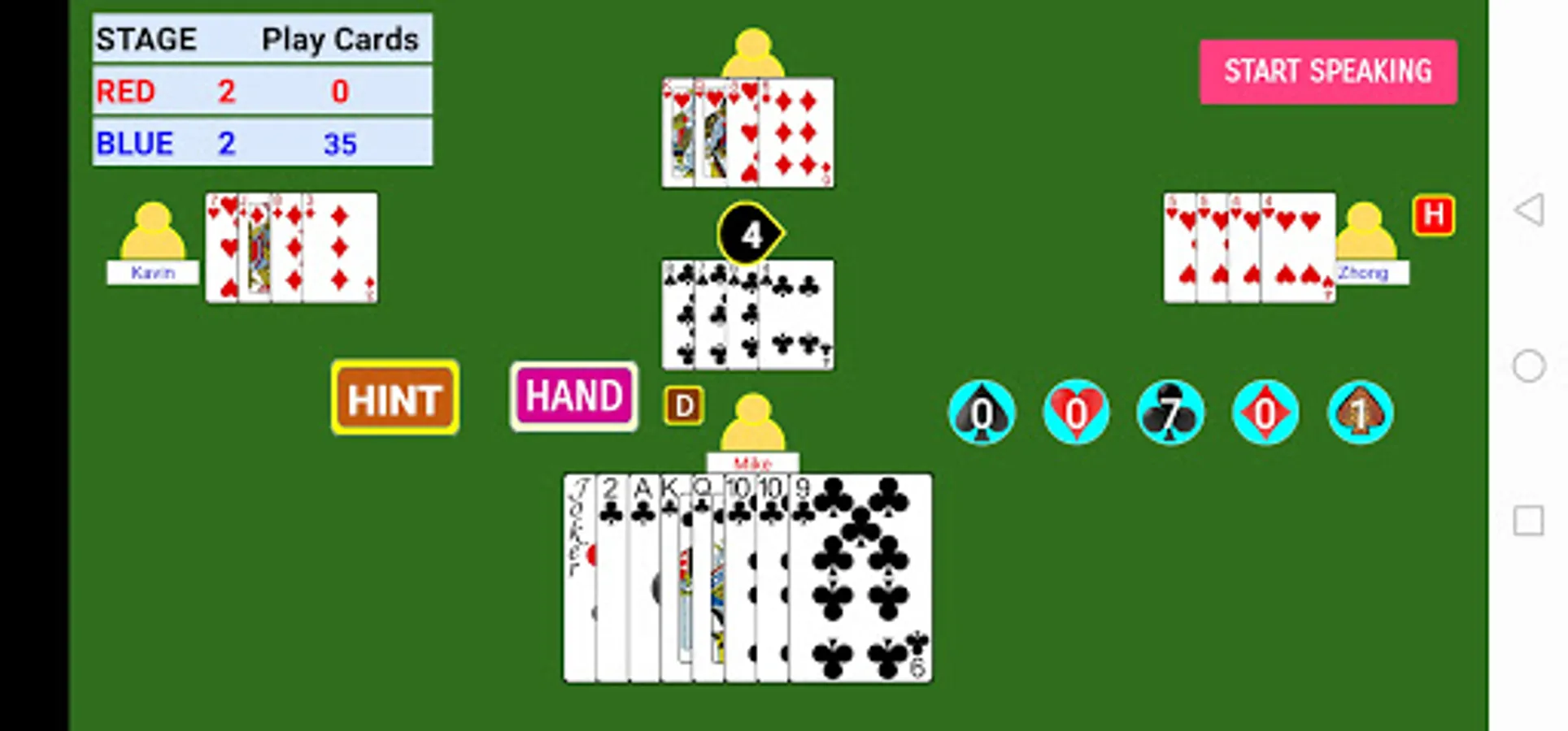 It involves 4 or 6 players, each team's goal is to get as many points as they can to level up. With our app, you are able to play with your friends or add bots to play by yourself. By using the hint button, it will be able to teach you how to play.