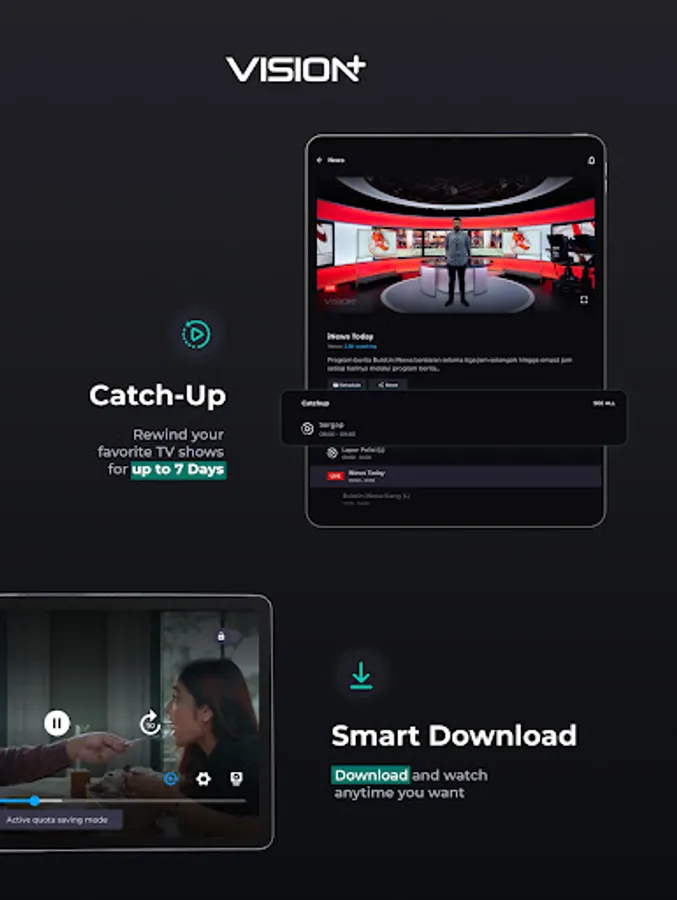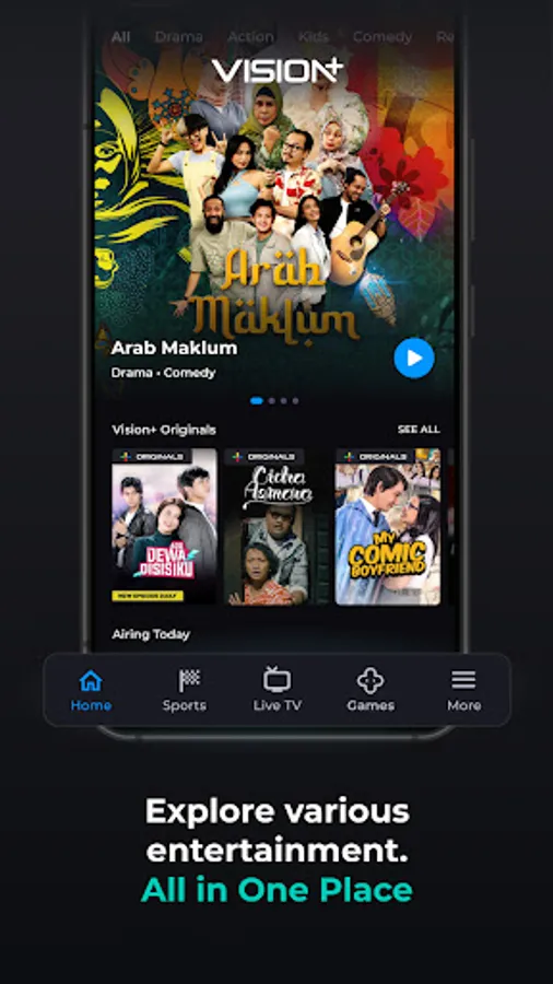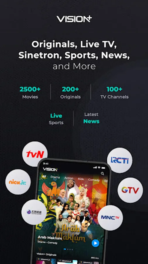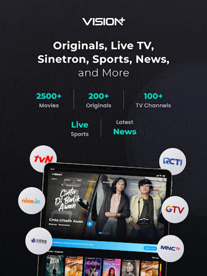 Vision+ : One app with million entertainment! Enjoy various live streaming services from national to international TV channels, watch 254.000+ hours of movies and series, play in-app games, and watch new exclusive Original series every month.