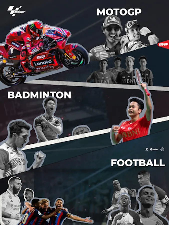 Stream exclusive live sports, and highlights, from football to Esports. We have Soccer Channel, MNC Sport, to SPOTV channels for well-known events such as MotoGP, Football, futsal, BWF Badminton, Wimbledon Tennis, WorldSBK, Formula E, Golf, SEA GAMES, Asian Games, and many more.