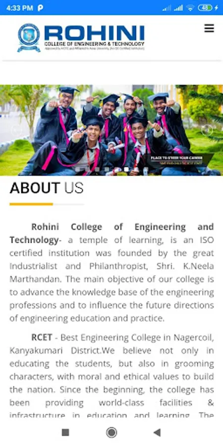 Rohini College of Engineering and Technology- a temple of learning, is an ISO certified institution was founded by the great Industrialist and Philanthropist, Shri. K.Neela Marthandan. The main objective of our college is to advance the knowledge base of the engineering professions and to influence the future directions of engineering education and practice.