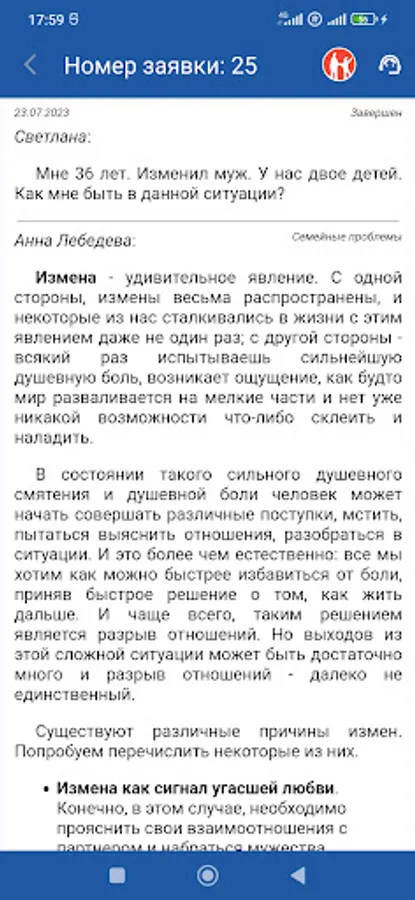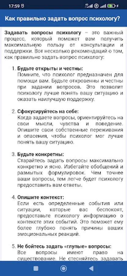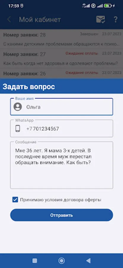 1. Written consultation: Users can ask their questions and share their thoughts through the app, describing their emotions and concerns in writing. The written format allows you to calmly think about questions and feelings, and allows the psychologist to examine each situation in detail.