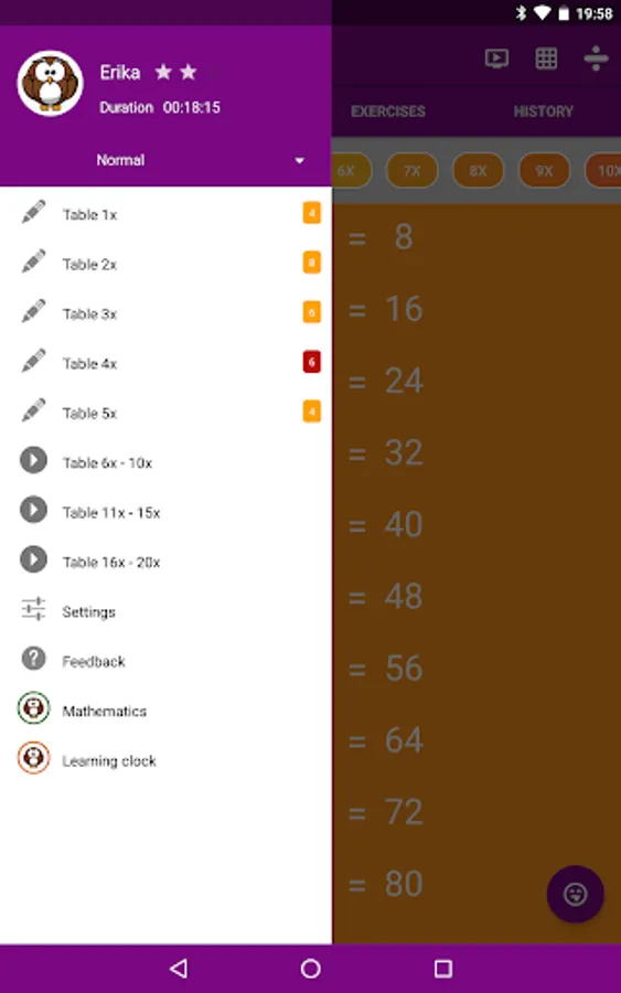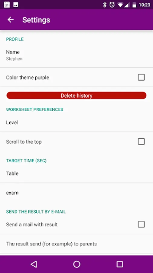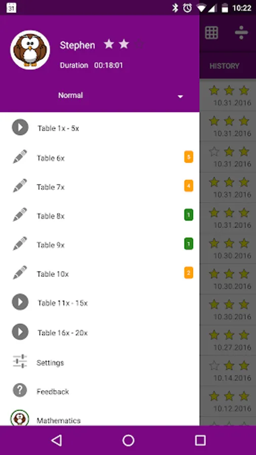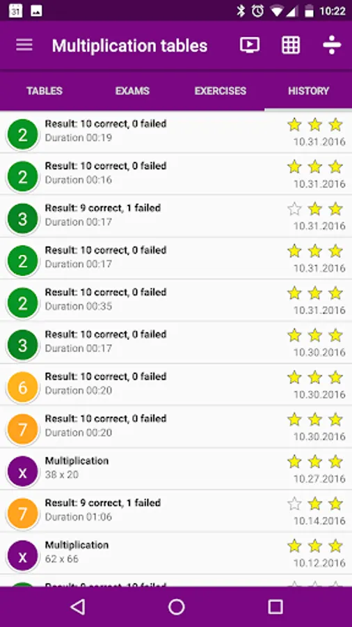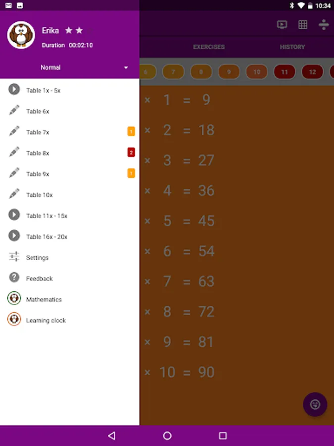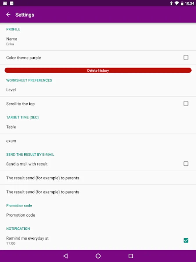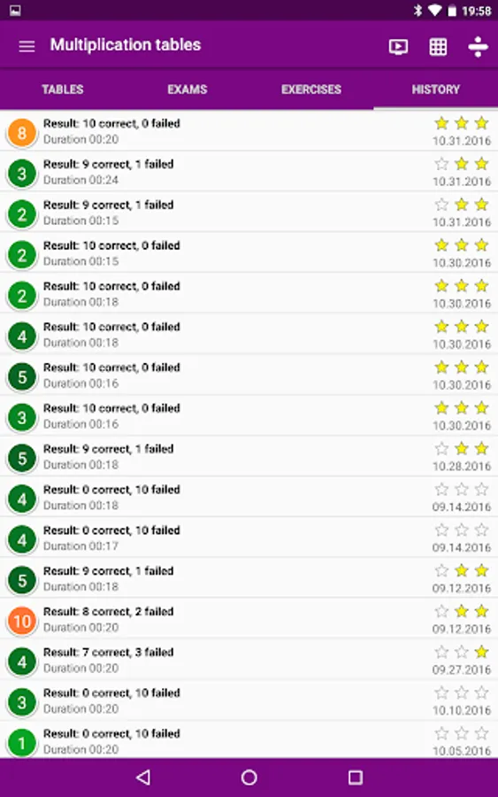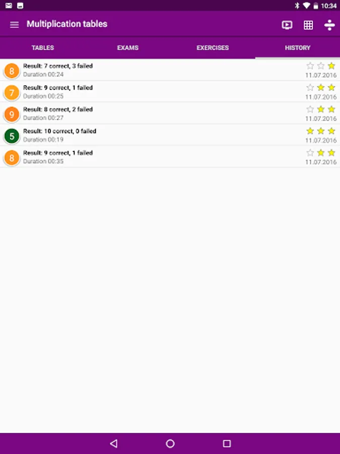 In the “History” screen, it is easy to track the results of the solved exercises. Furthermore, the completed tables can automatically be sent to the parents set email addresses.