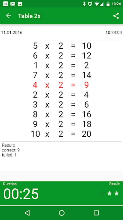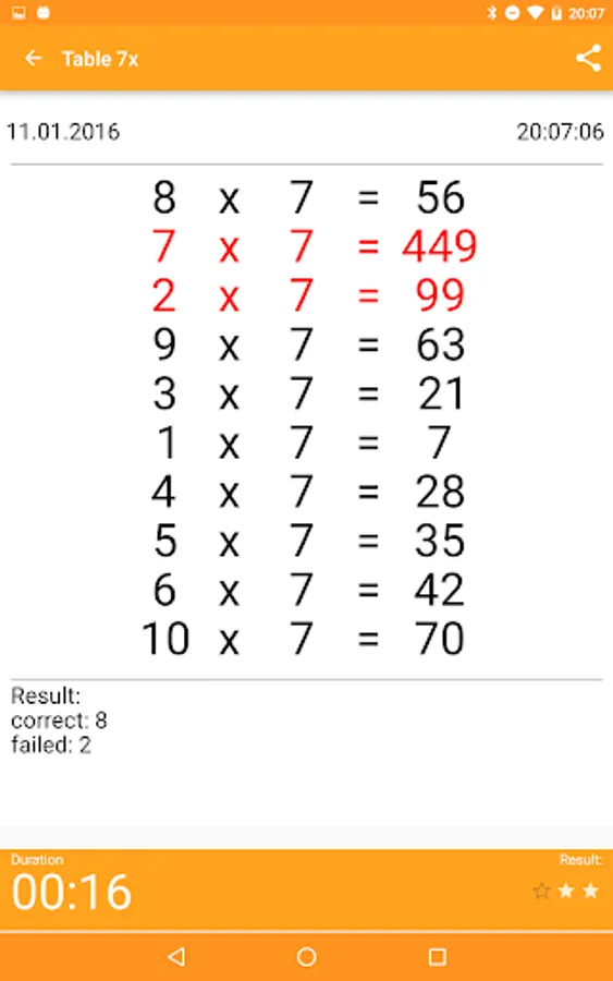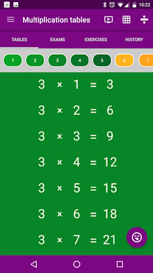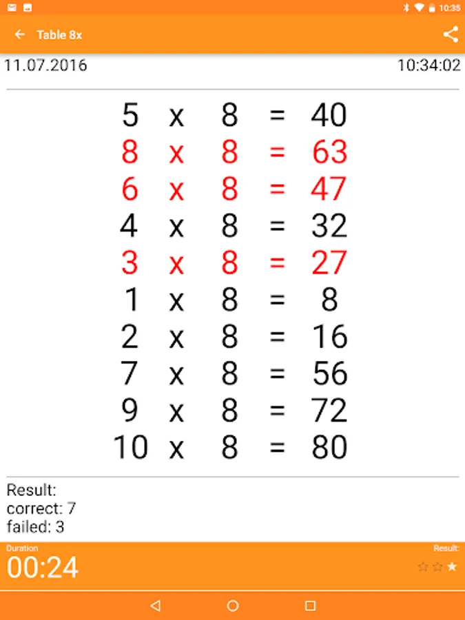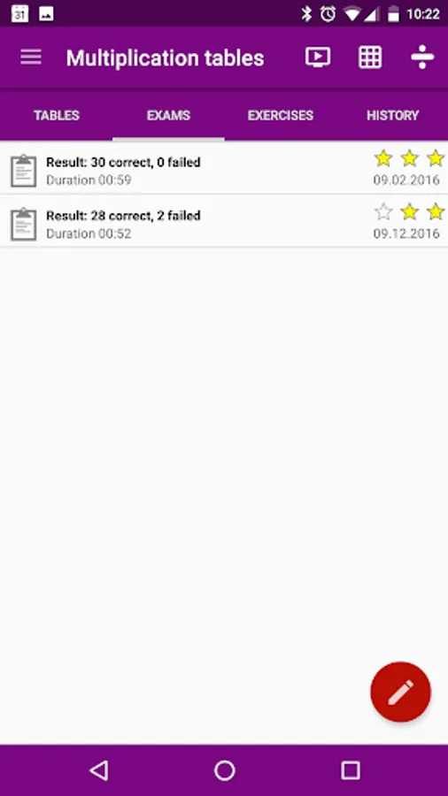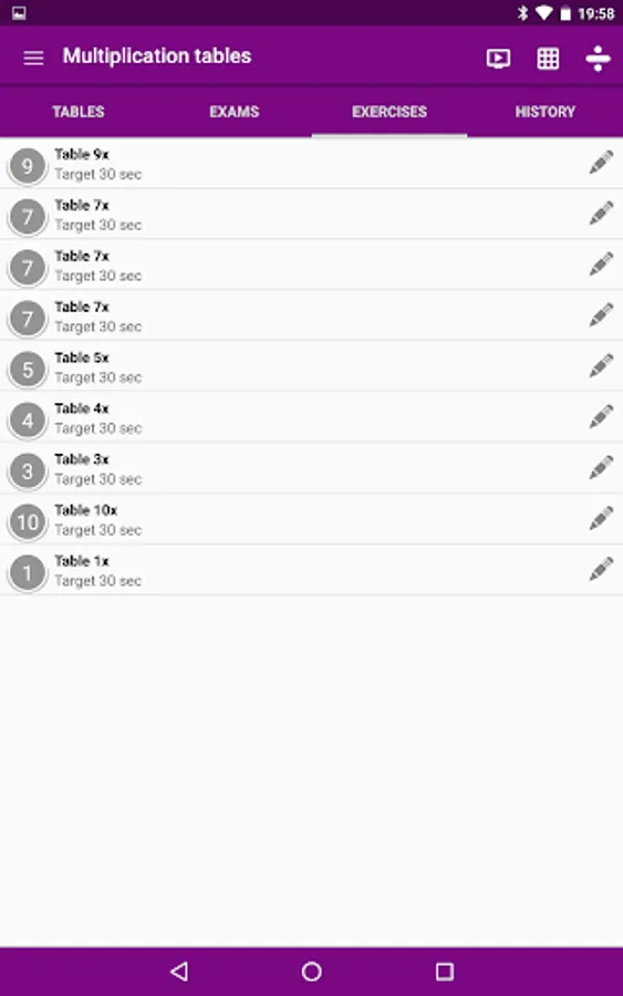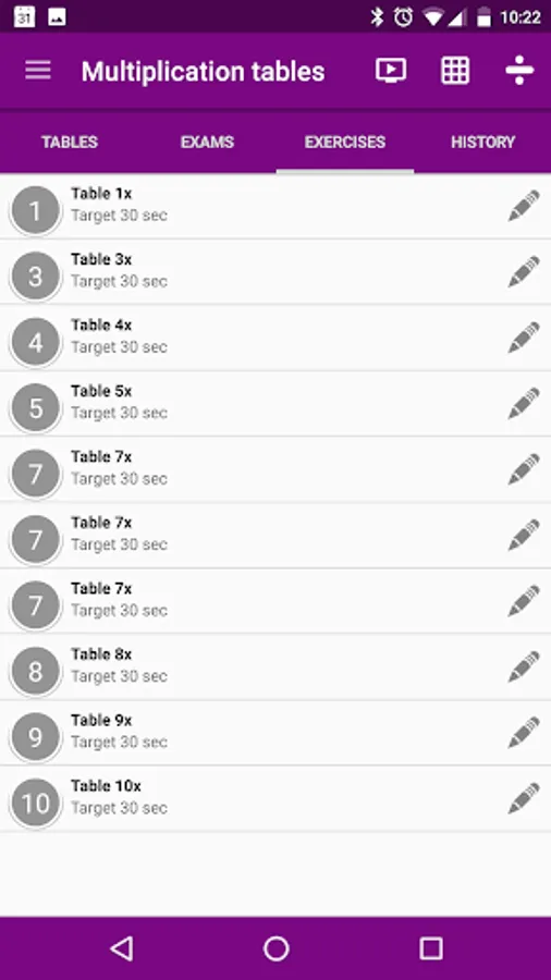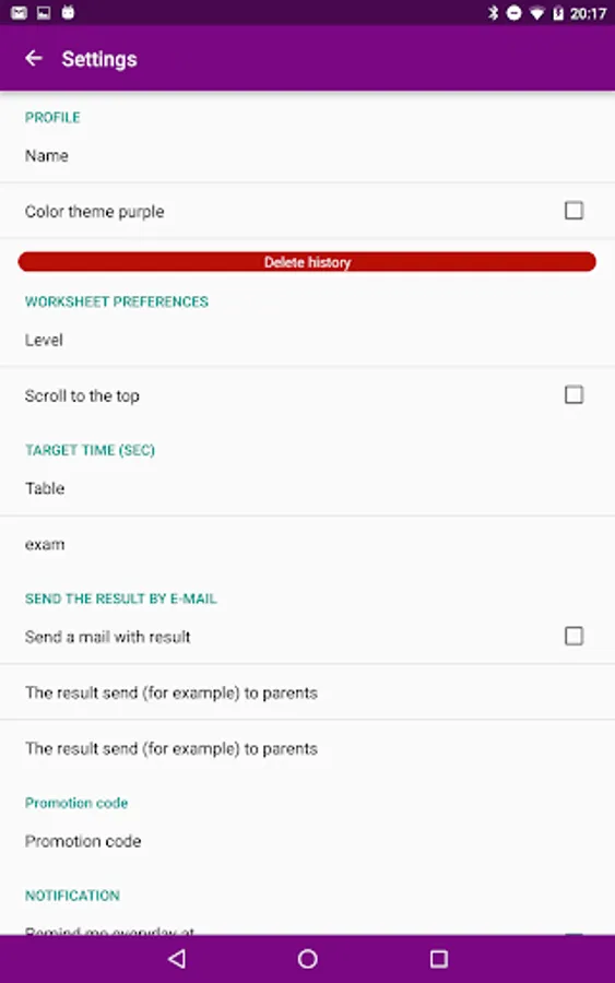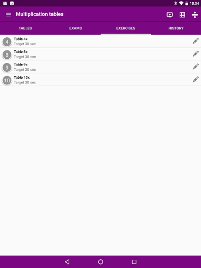 In the “History” screen, it is easy to track the results of the solved exercises. Furthermore, the completed tables can automatically be sent to the parents set email addresses.