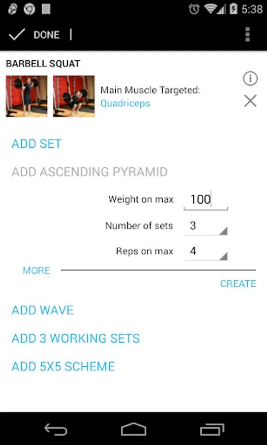 4. Tools for quick exercise set creation. You’ll be able to create, for example, a set pyramid in just a couple of clicks. Fill-in the results for the toughest set and the app will create all intermediate sets automatically. Not only pyramids can be created but also other workout organization schemes (5x5, 3 workout sets, wave).
