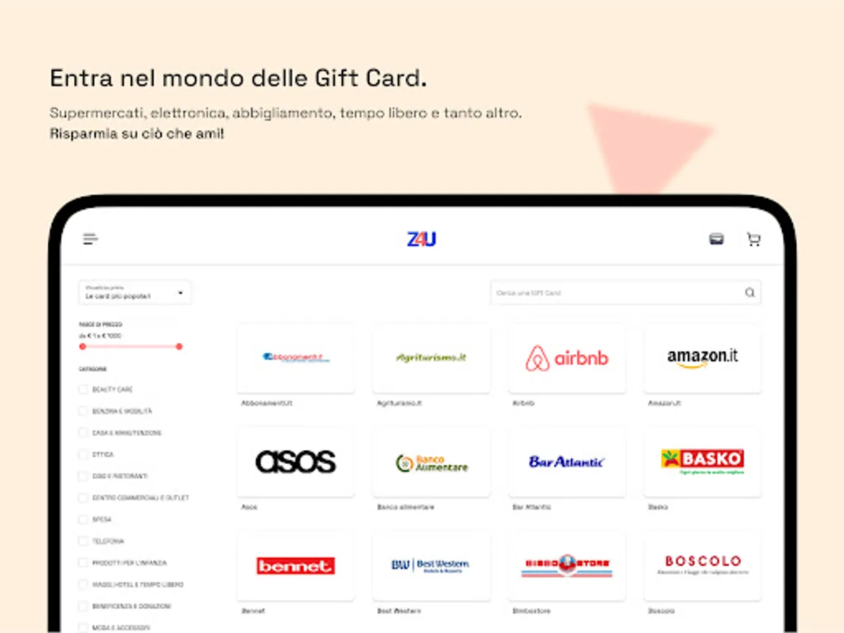 The Z4U wallet allows you to have all the discounted Gift Cards of hundreds of brands for supermarkets, electronics, clothing, leisure and much more collected in a single app, easy and quick to use and always at hand.