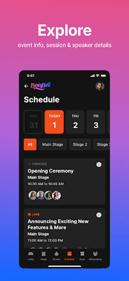 View an entire virtual event's schedule at-a-glance, including details on which sessions are taking place, as well as when and where.