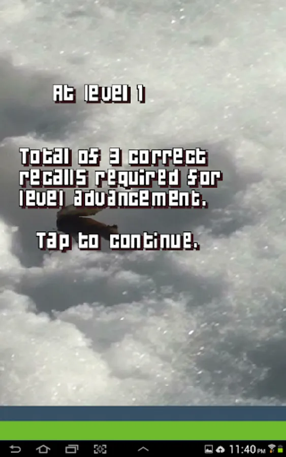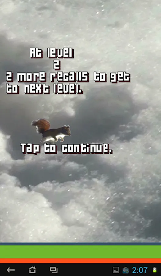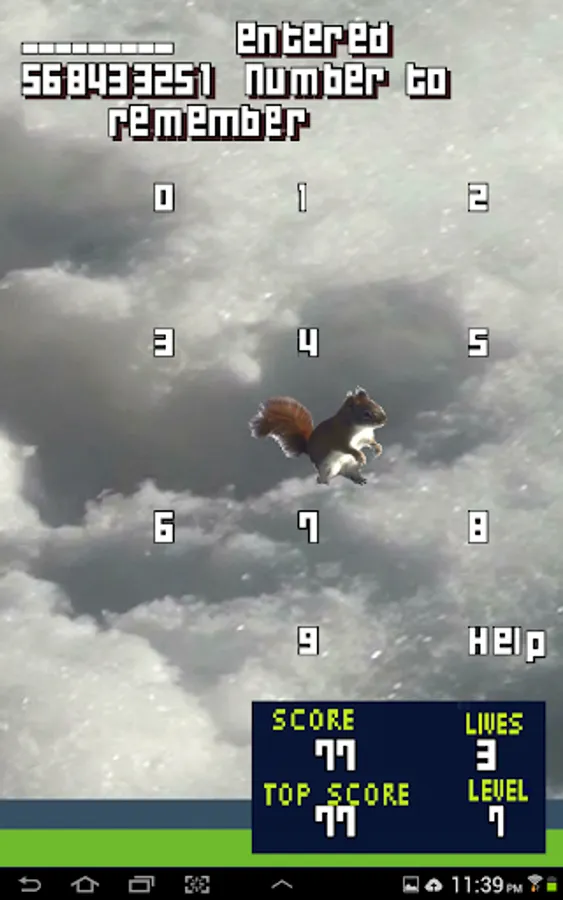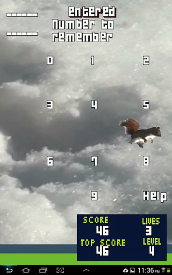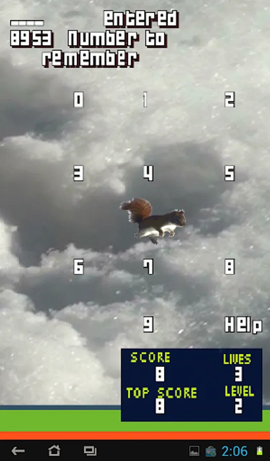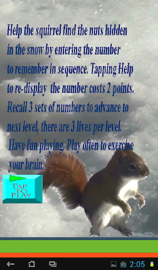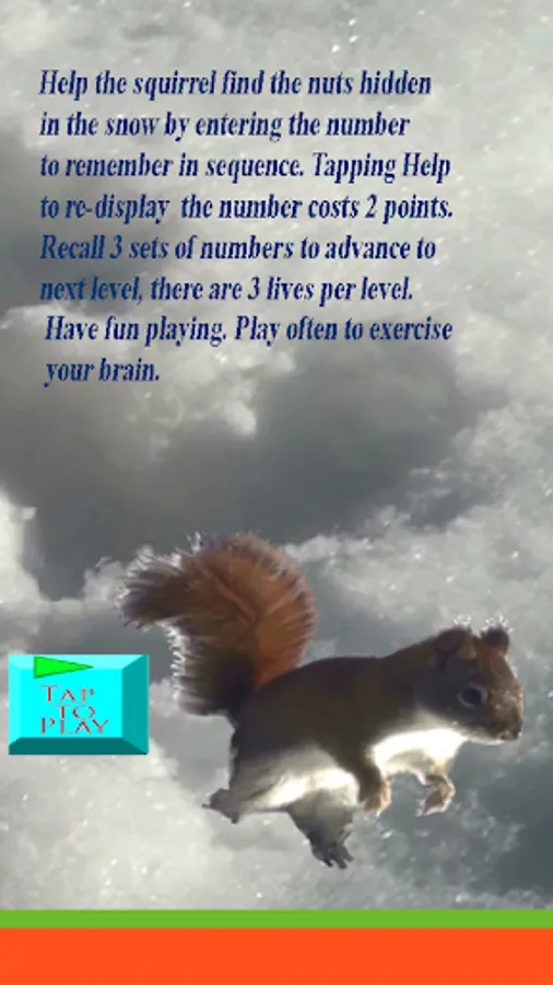 A brain game to help exercise short term memory. Help the hungry squirrel find the nuts in the snow by remembering a random number.