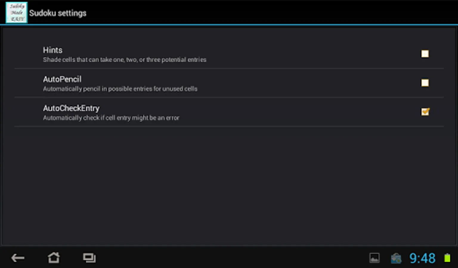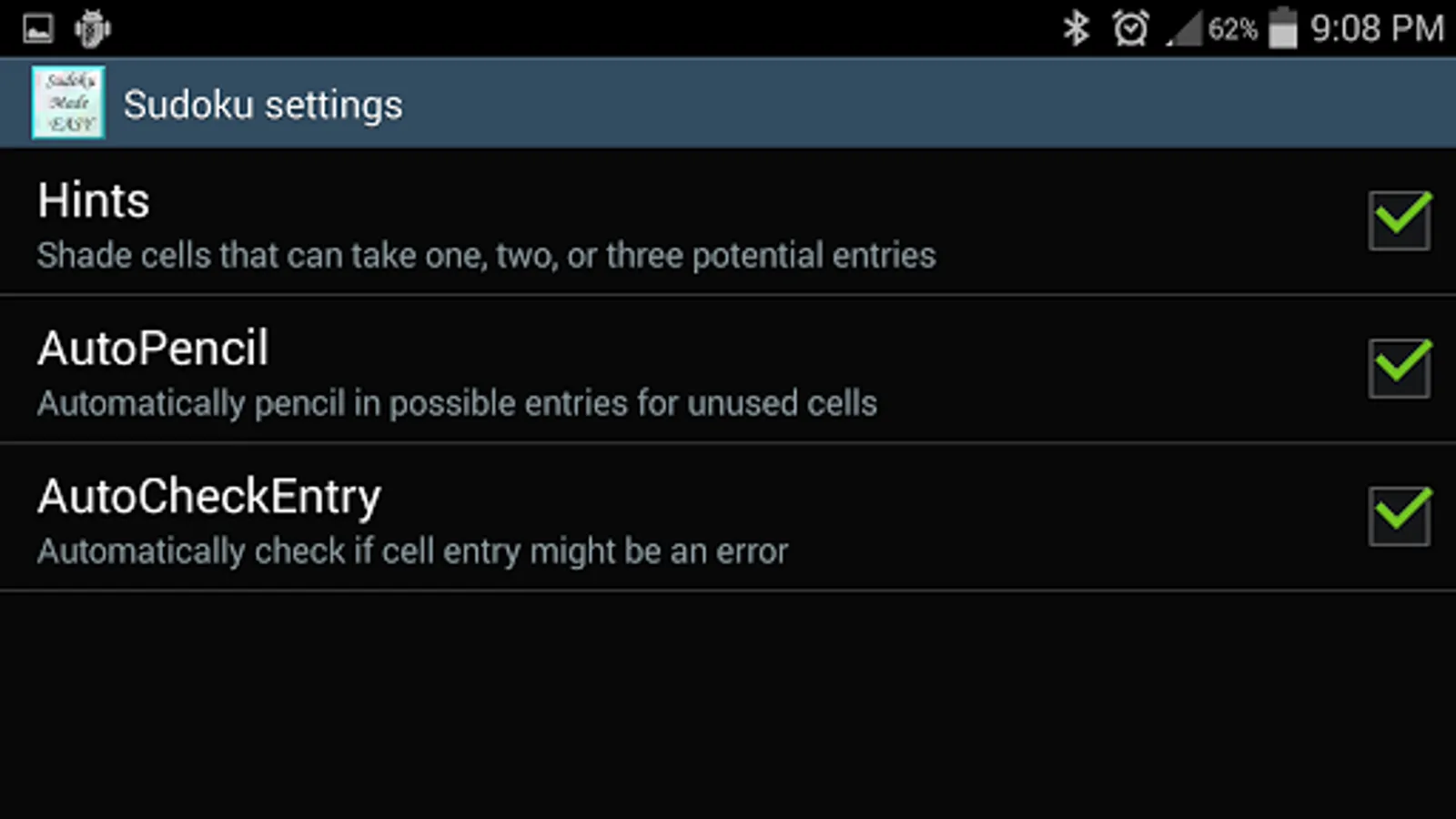 Some new players get frustrated initially with the complexity. This version of Sudoku allows the user to tailor help options to make the puzzles very easy to solve or gradually reduce help options to make the puzzles harder to solve. In addition, three levels of puzzle difficulty are provided.