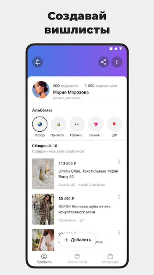 Zultee is not only about gifts, here you can save any planned purchases just so you don't forget. Save screenshots, supplement them with notes and links to websites / social networks, combine them into albums by topics: cosmetics, clothes, sports, cottages, real estate, cars ... Everything will be in one place and there is no need to waste time searching for the necessary information in the gallery and notes smartphone, in the wish list of endless online stores, in the bookmarks of browsers and social networks.
