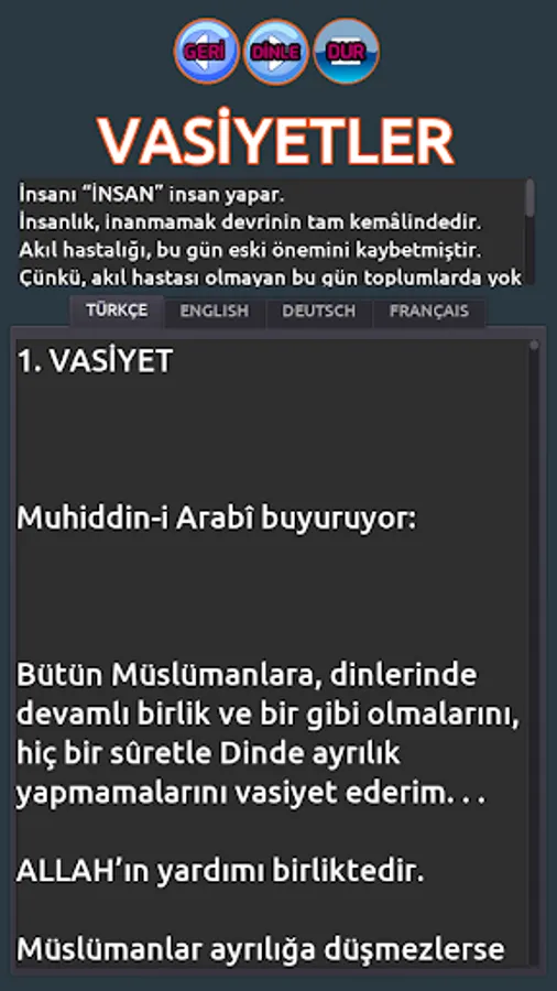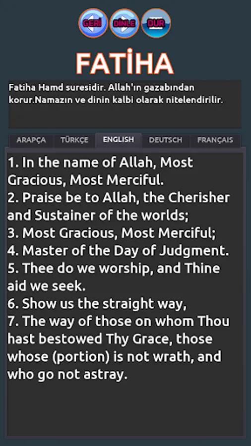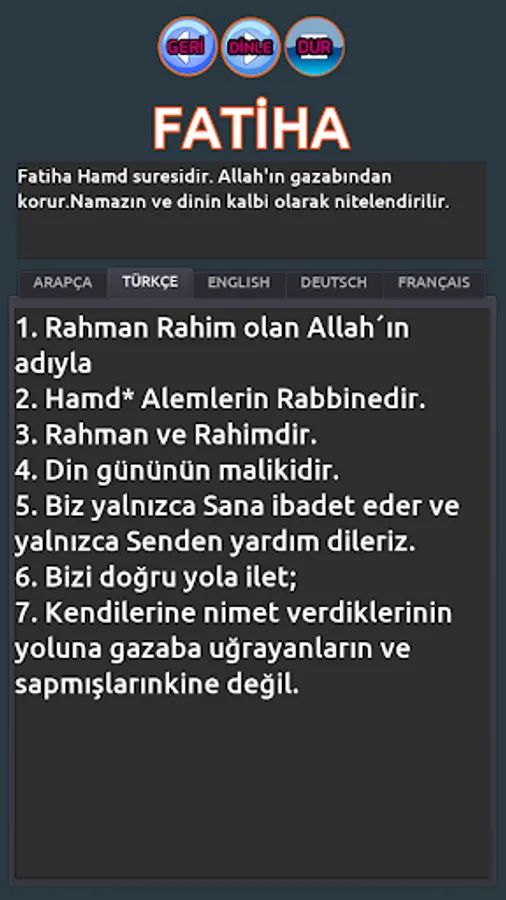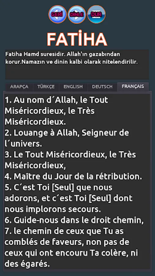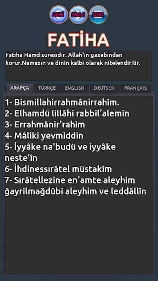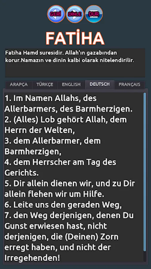 In addition, at the request of my relatives and friends abroad, I prepared a program with translations of Arabic, Turkish, English, German and French languages so that people who speak other languages have easy access to the suras and prayers.