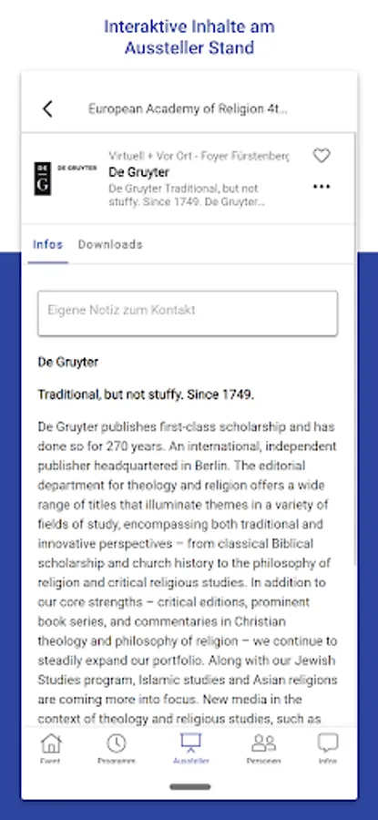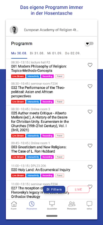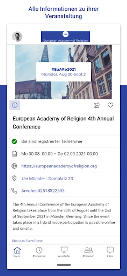 The European Academy of Religion is holding its 4th Annual Conference in Münster (Germany) from August 30th until September 2nd this year. The conference will take place as a hybrid event and offer the possibility for participation online and on-site. This App will help you accessing the panels, keynote lectures and discussions in an easy way and support you in creating your individual conference schedule as well as giving you the opportunity to get in contact with other participants