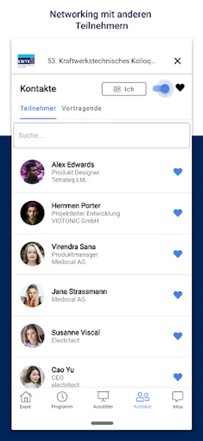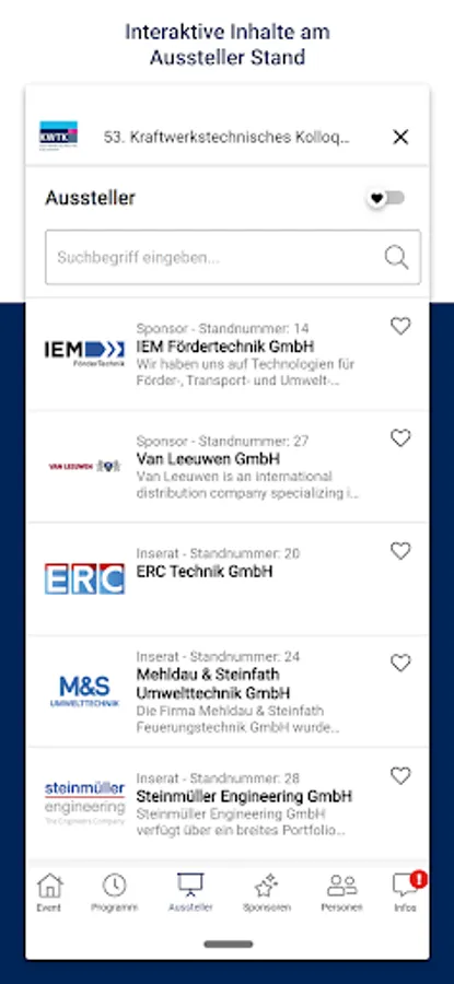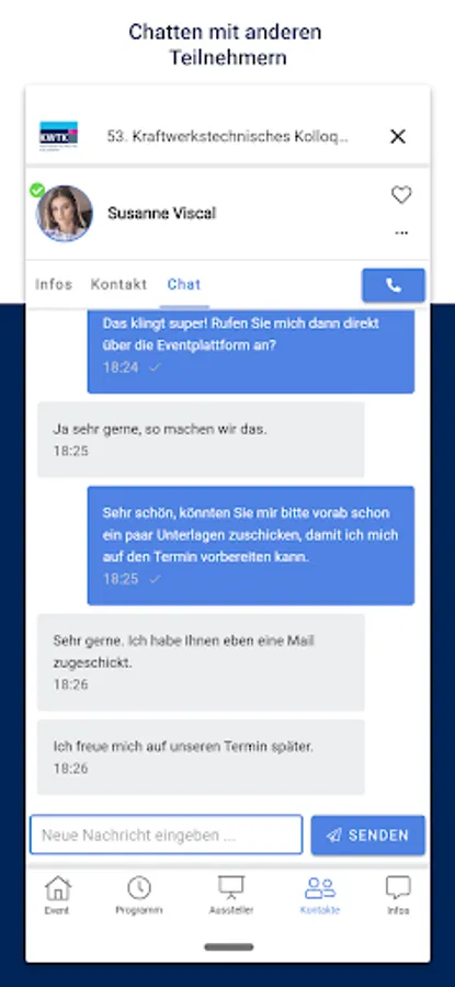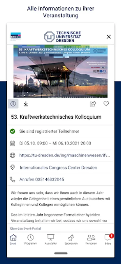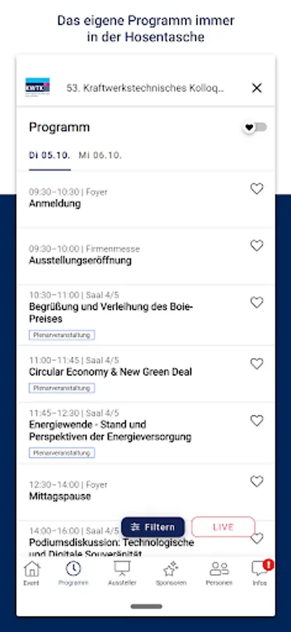 Our app offers you a versatile tool for our conference: You can plan your visit to the colloquium individually, receive all information and background material, can exchange ideas with other participants and the speakers, visit the company fair and give us feedback.