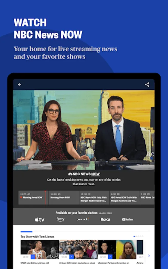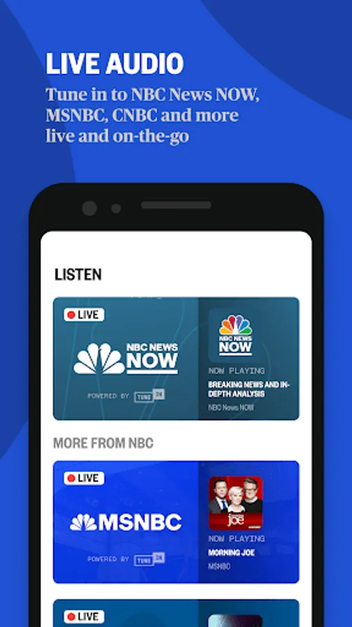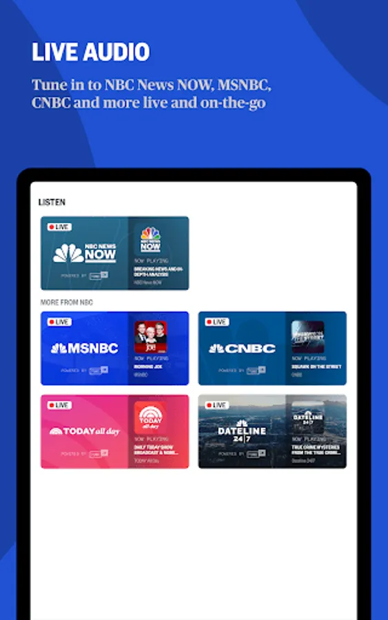 • Bring NBC News Now and more on the go with streaming live audio (no authentication required!)