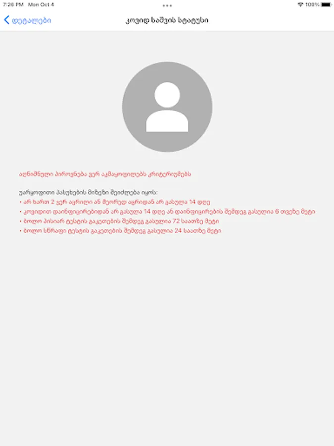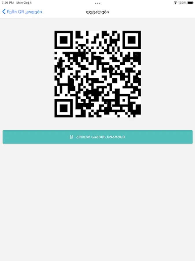 The application is used to provide access to various events and spaces in Georgia. Both Georgian and foreign citizens can download and register the application. The application generates a QR code, through which the status of Covid is checked (meets / does not meet the criteria).