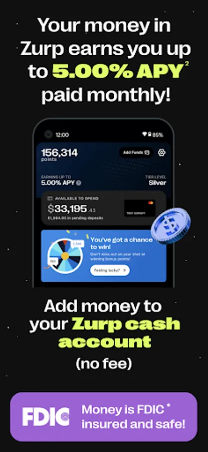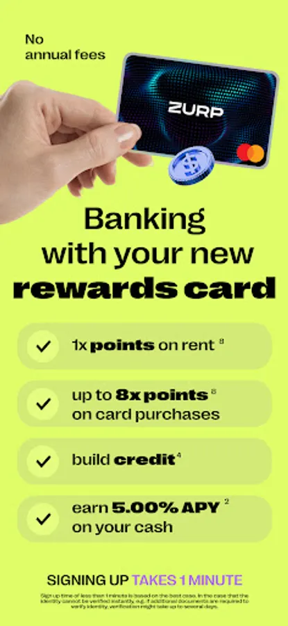 Signing up for Zurp¹ means you get a Zurp World Mastercard® and a Zurp Cash account. Think of your Cash account as a supercharged bank account that earns 5.00% Annual Percentage Yield (APY)² on your money. It comes with no monthly fees and it sets the limit to your Zurp Card, too.