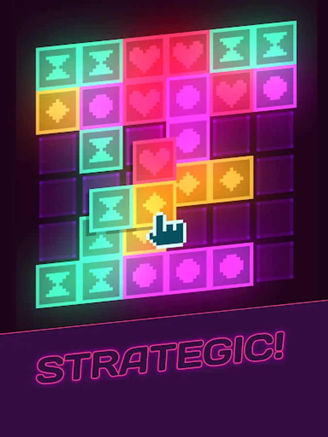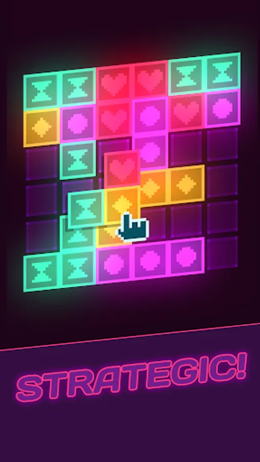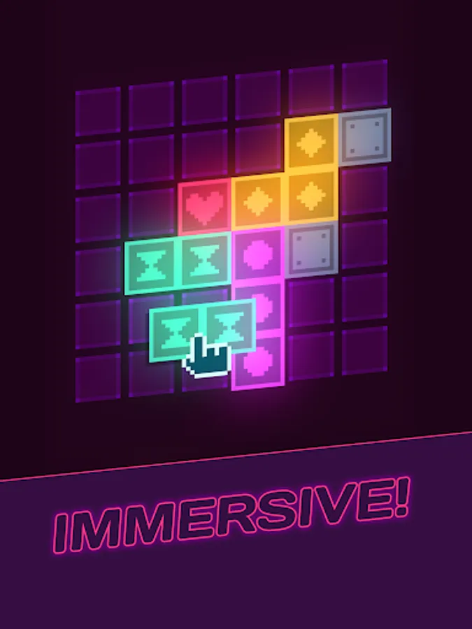 Place neon-coloured tiles on on the board. Match groups of four tiles to clear them, or match larger groups to multiply your score. Consecutive matches amplify your scoring power! As you progress through the levels you'll have to think more and more carefully to avoid running out of space. But you'll also unlock new tiles, power-ups and bonus pieces to help you master the GlowGrid!