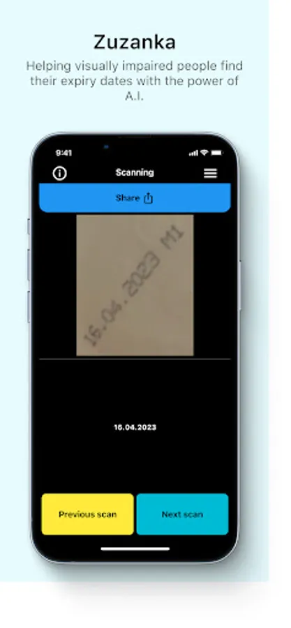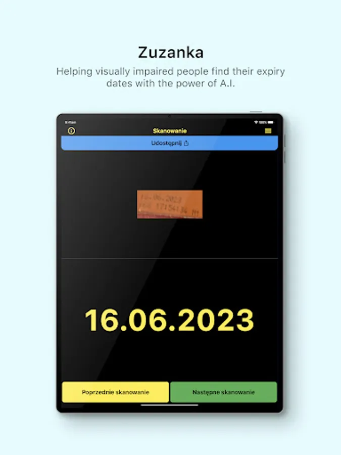 Zuzanka is the world's first expiry date scanner. The app makes it easy to locate expiration dates on food products, converts them to text format and allows export to other applications. Zuzanka was created to support the blind and visually impaired people, but it will be useful to anyone who wants to keep their kitchen tidy.