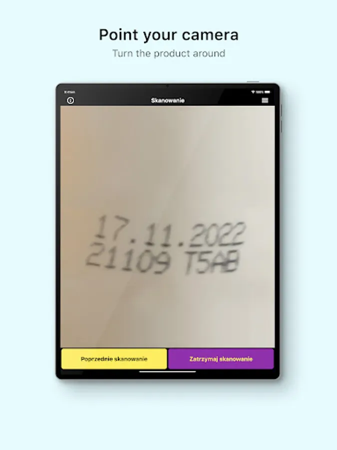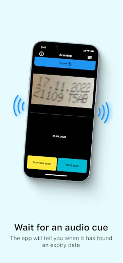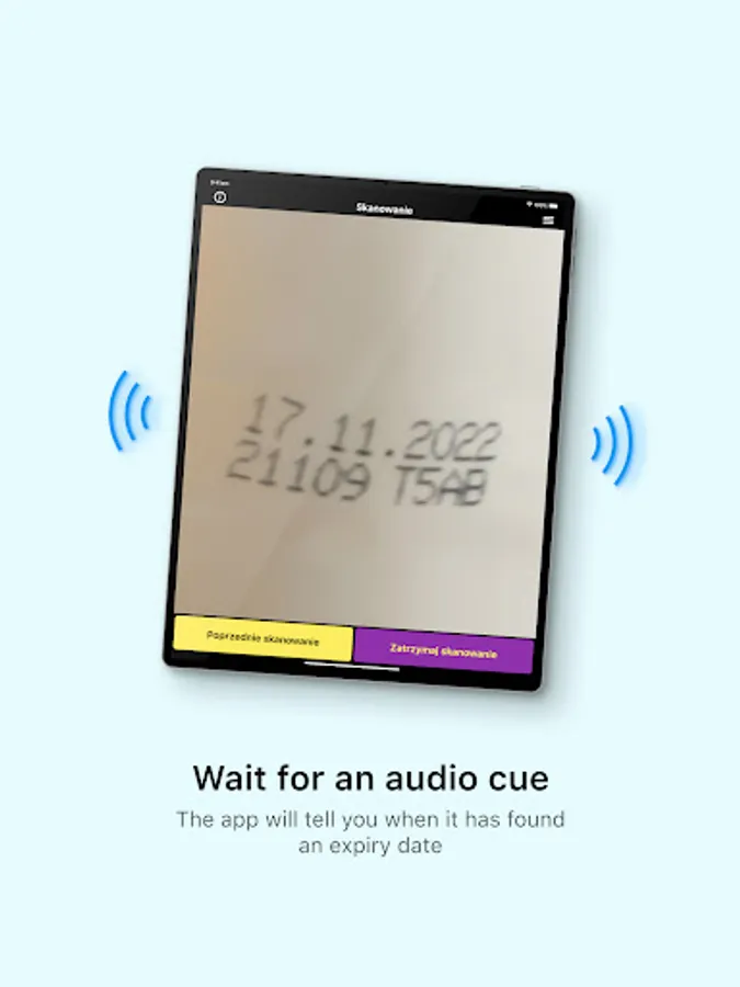* Easily find the expiration date on the packaging. The guiding sounds generated by your device will help you with this. If the scanned date indicates that the product is expired, the application will additionally inform you about it.