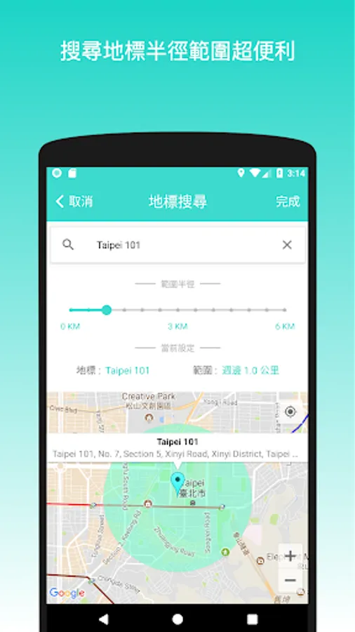 即將展開新生活嗎?只要將新公司、新學校設為中心地標,隨意找尋方圓 500 公尺、1 公里的物件!