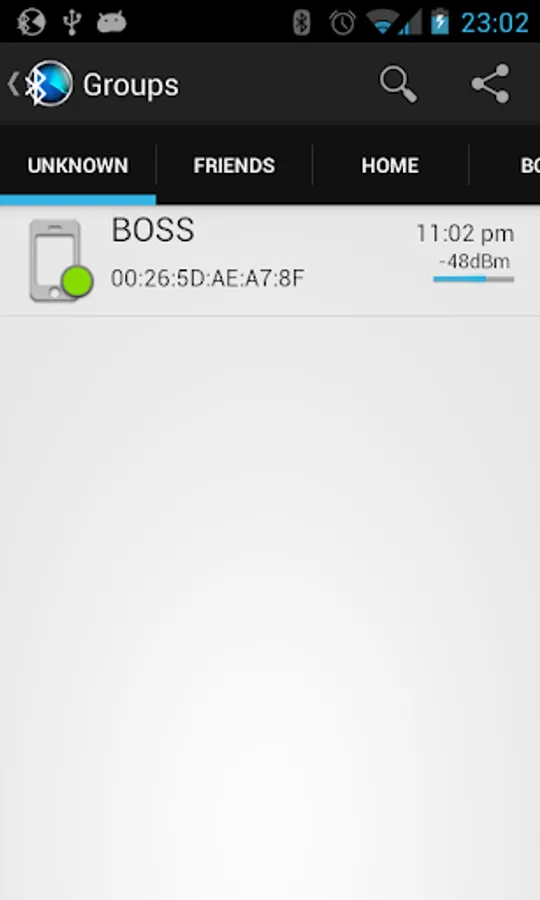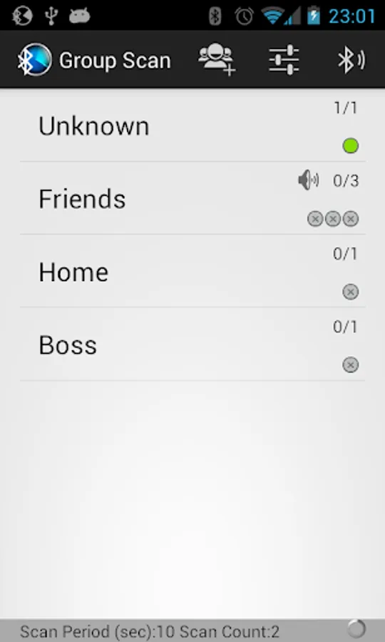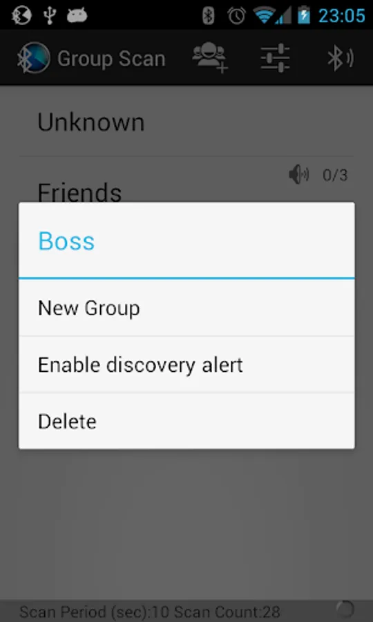 A. Open. Add some new groups. Start Bluetooth discovery scan. Go inside Unknown group and long press on newly discovered device to move to the desired group. Once you are familiar with the navigation, go to Settings to set filtering and discovery alert options. You can long press on the group to enable or disable discovery alert.