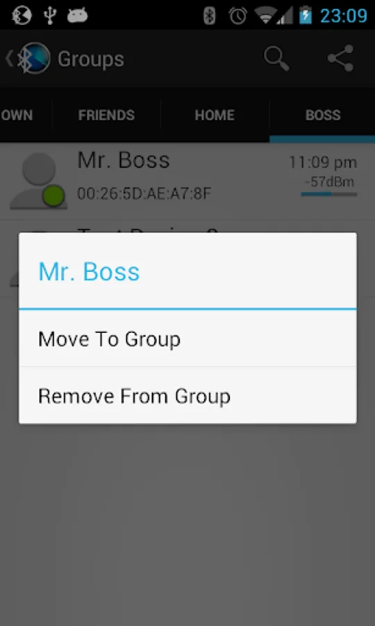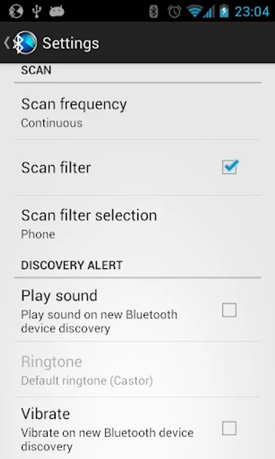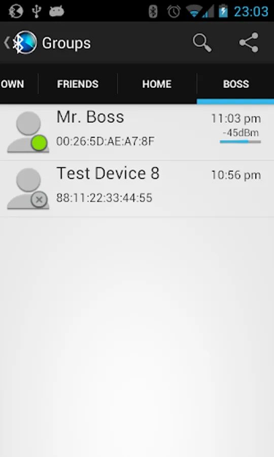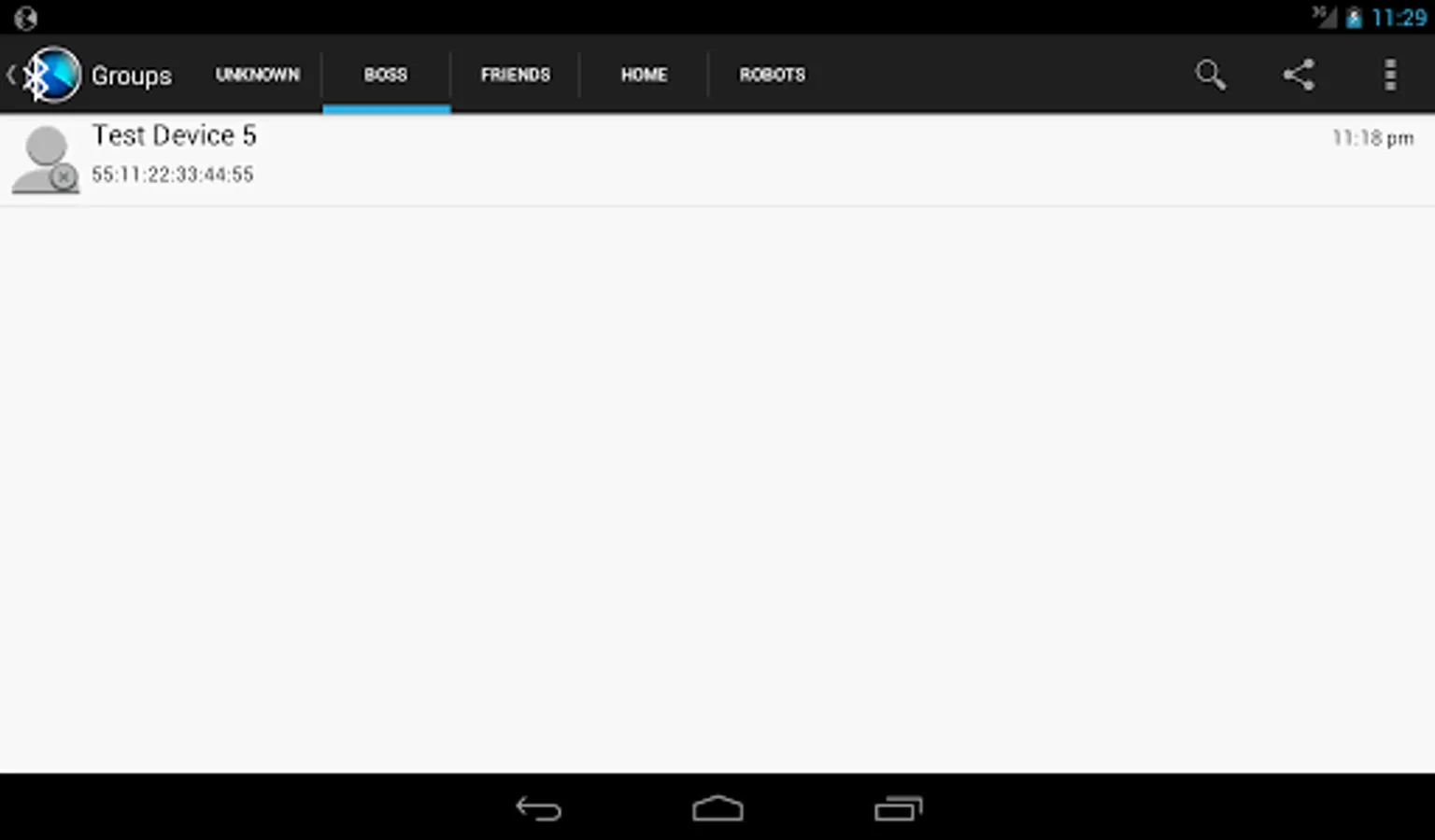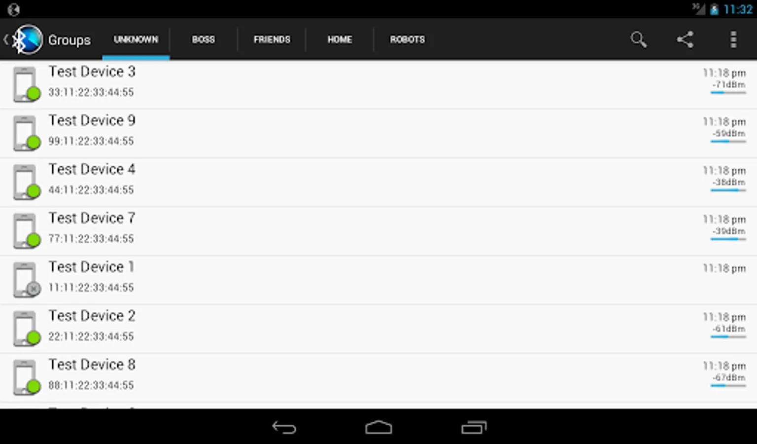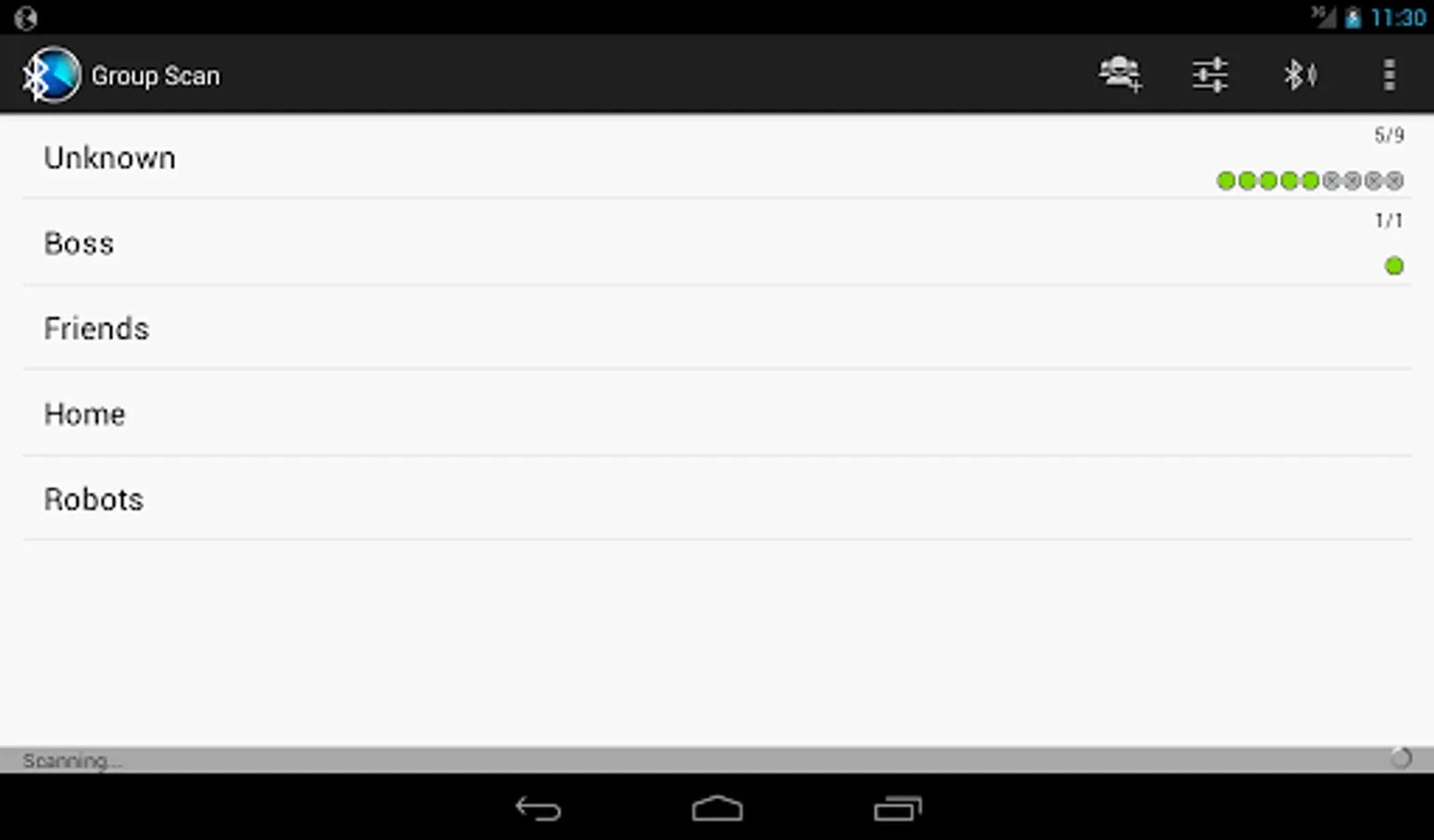 Group Scan is an ads-free Bluetooth Scanner application that allows not only discovering new Bluetooth devices but also tracking previously discovered devices arranged in groups such as Boss, Friends, Family, Robot etc. The user can enable device discovery alert to notify by vibration or sound if there is a new device in range in the specific group. There is also option to filter devices by Bluetooth device class. To be discovered, Bluetooth device must be in discoverable mode.
