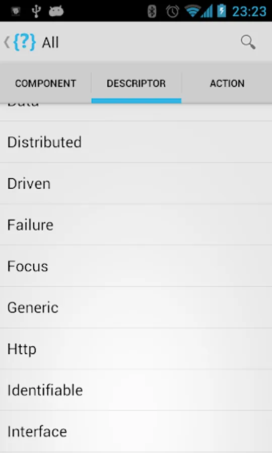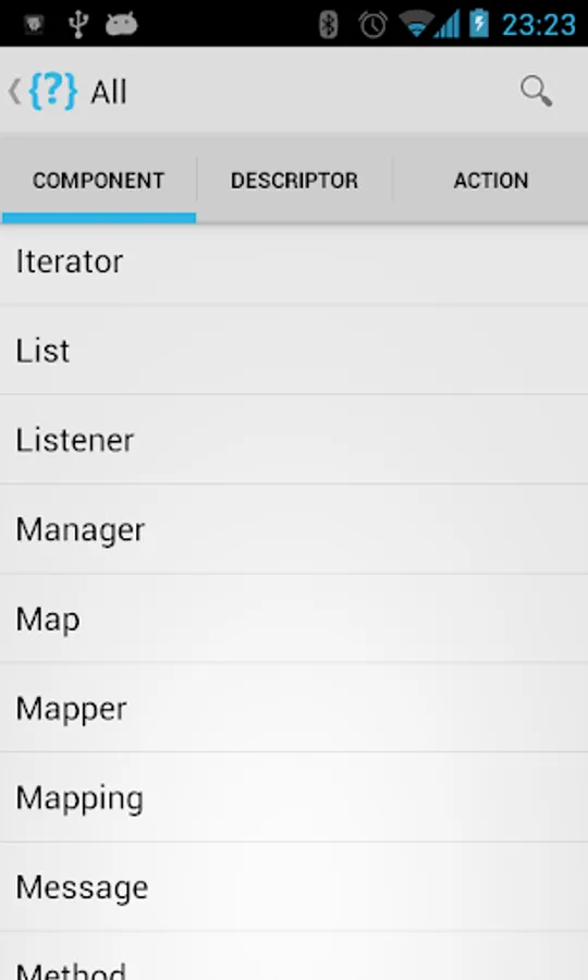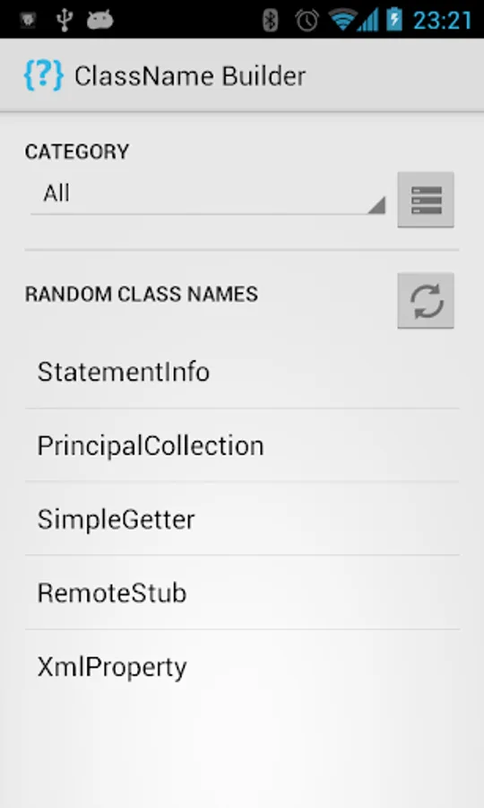 The app contains words grouped by components, descriptors and actions. User can also generate Random Class Name for the selected category.