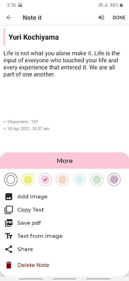 Note it is an awesome notes app or note pad that will help you save your notes beautifully and safely for you to use them anytime you want. Note it is designed with beautiful layout that will save your notes and also helps to distinguish between different notes by giving options of beautiful colors. Note it also provide various services for your notes likes saving your notes, sharing your notes, creating a pdf for your notes, adding image in notes, getting notes from images, and even reading notes for you. When you open Note it, you can click on the add button to add notes, you can add title, subtitle, content and image and when you're done click on the done button to save your notes. While writing notes you have a bottom drawer where you'll find different options like for deleting note, creating pdf, saving to clipboard etc, you can use them accordingly. You can search your notes in the search bar provided in the home screen. You can choose different colors to highlight you important notes.