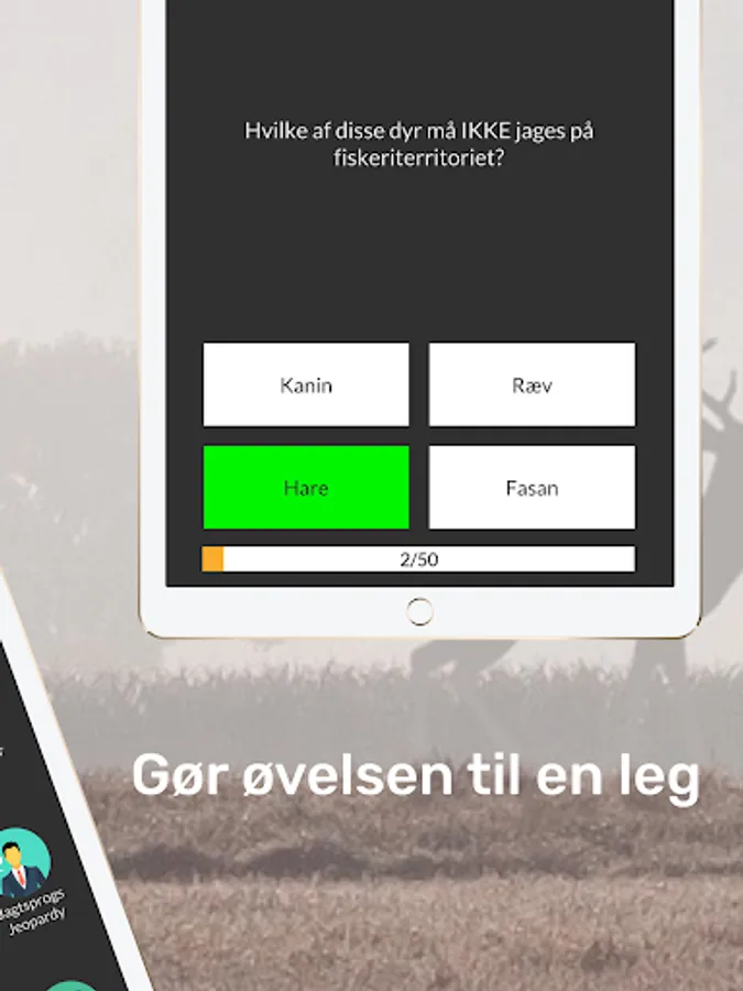 With the JagtQuiz app, you get a unique tool to practice the important hunting theory, which is so important when you have to go hunting alone or with your hunting buddies.