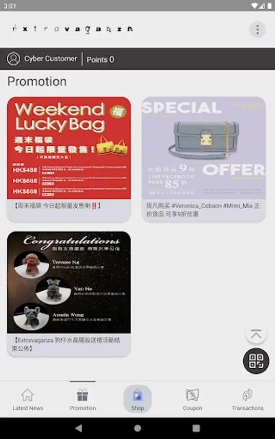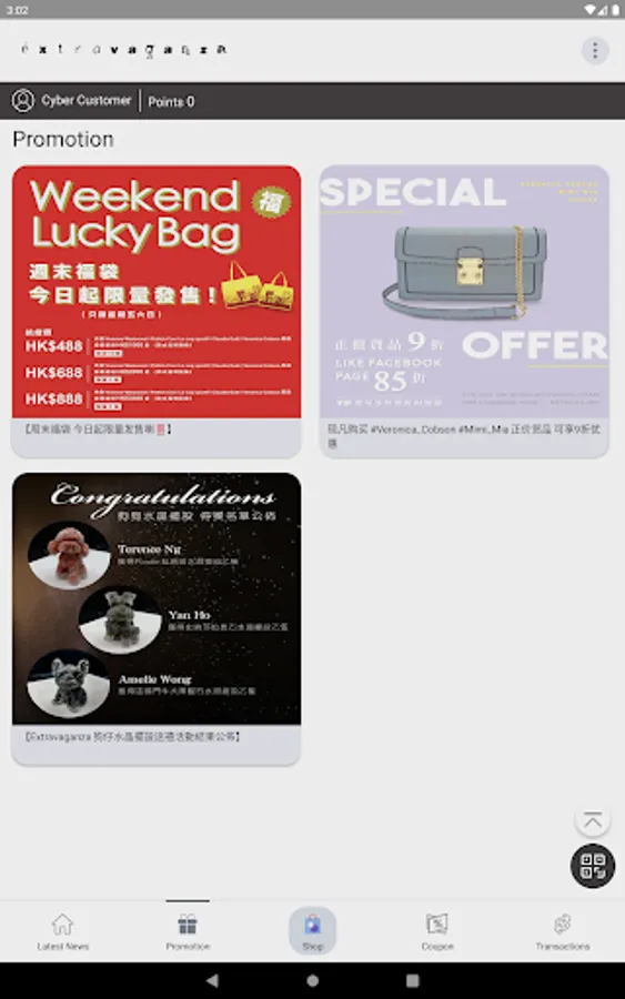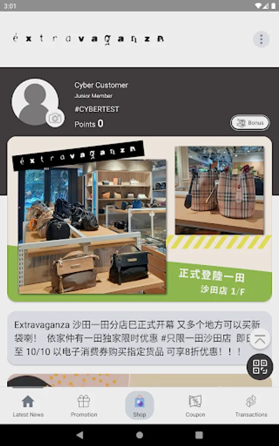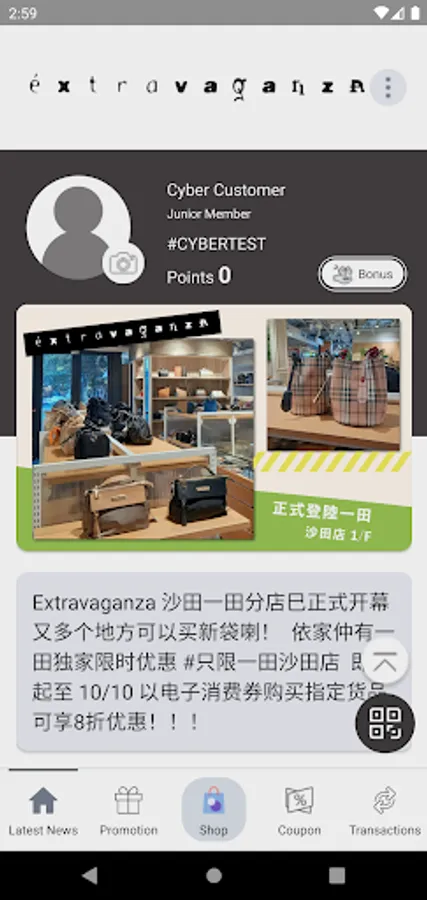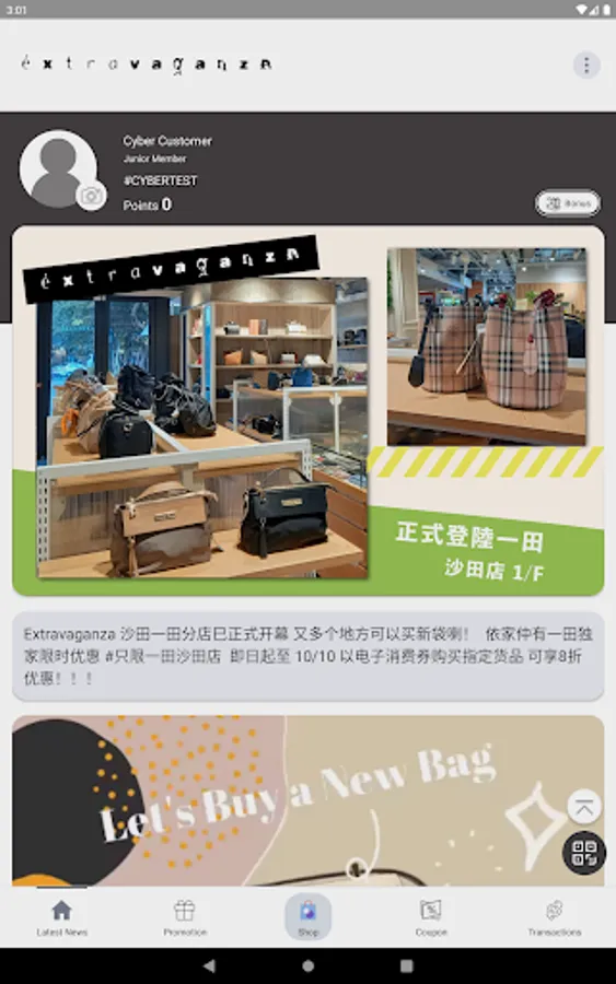 The member APP of extravaganza can check the latest news and discounts of stores and online stores in the APP. Members can also use and accumulate points in stores. Members can also use coupons in the APP in stores and online stores.