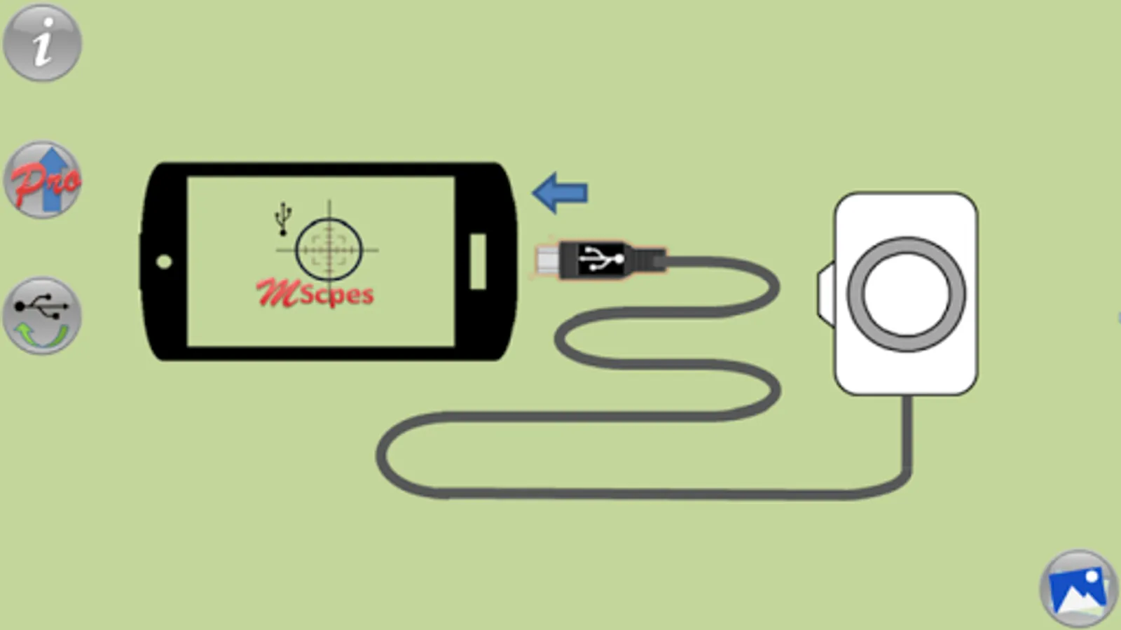 MScopes enables the users to view, take pictures and record videos for USB camera based digital microscopes, endoscopes (non medical), borescopes, digital camcorders or webcam connected to smartphone or tablets. For USB camera with type-A connector, an OTG (on-the-go) adapter is required to connect with micro USB in Android smartphones.