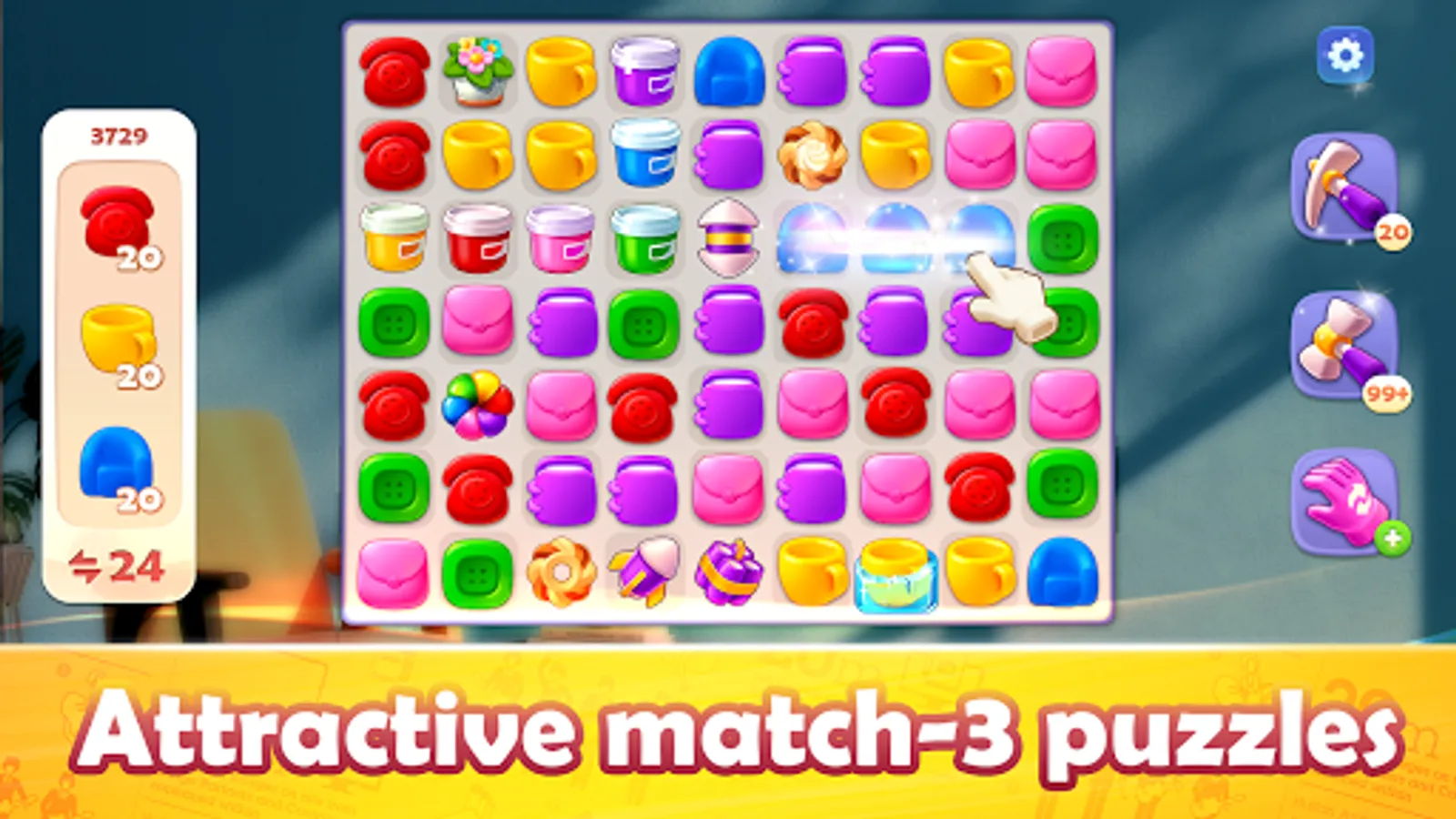The architectural style within the game can also be reflected in reality, matching different styles of furniture to exercise their design in reality🏠. To get more design inspiration, you need to solve the match-3 puzzles. Trust me, the match-3 part is just as exciting as the building part!💕