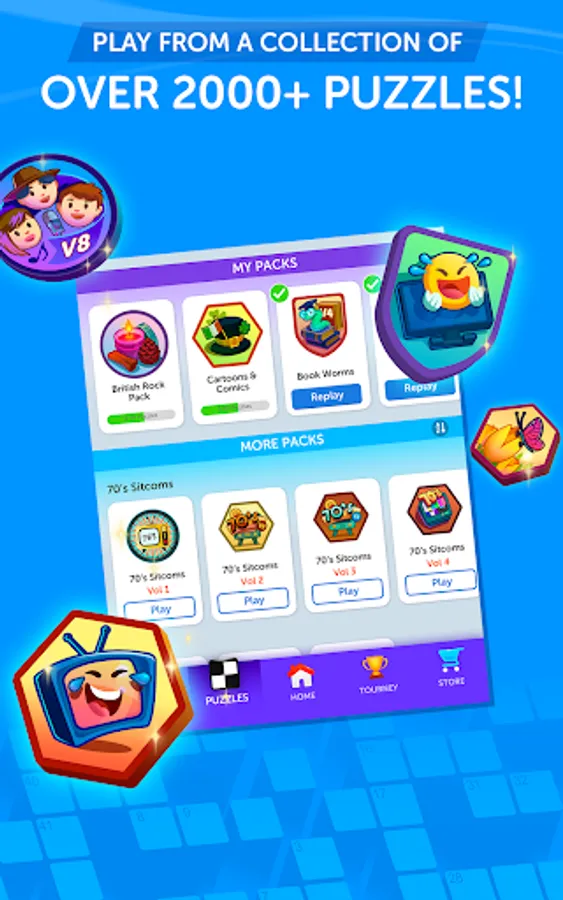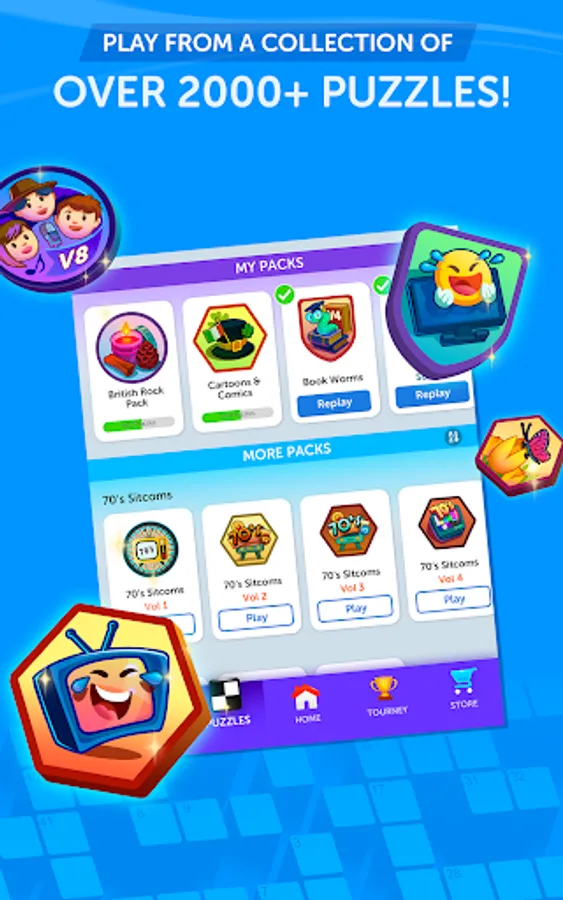 Movie buffs, sports fanatics and nerds of all kinds, rejoice! Add a pack of 5 themed puzzles to your collection. Solve them all to collect badges and become the ultimate crossword master.