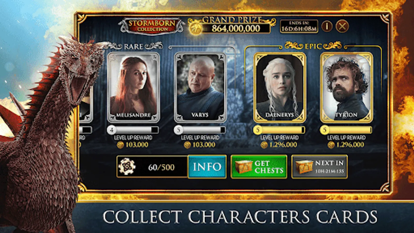 Collect free coins to keep spinning the slot machines, and aid your efforts to become a slot games legend in the Seven Kingdoms! Go all-in to become a casino games high roller and complete conquest games to capture all the territories of Westeros!