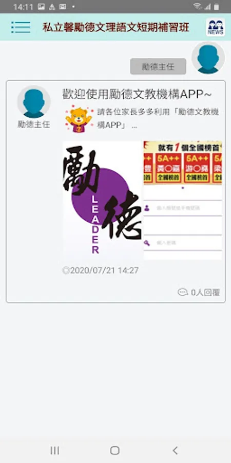 勵德文教機構APP提供親師互動平台以及家長個人化的貼心服務,舉凡班務訊息、親師溝通、學生到離班點名、大小測驗成績紀錄等,讓家長更加了解學生的學習狀況。
