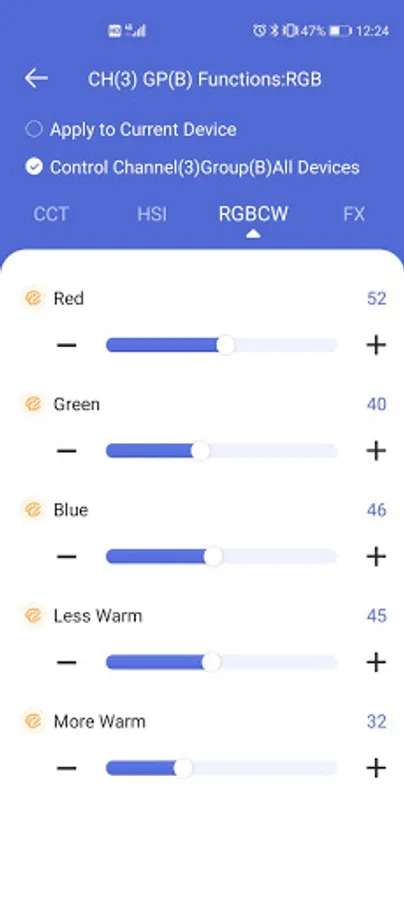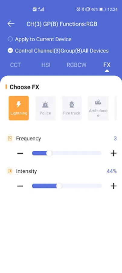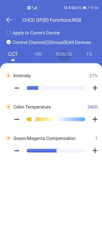 This is an APP that can control the video light through the bluetooth of the mobile phone. With the APP, multiple devices can be control in group and the light can be switched and controlled among four modes which are CCT HSI RGBCW FX.