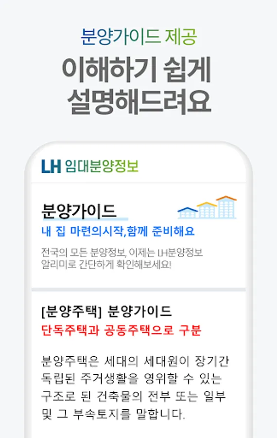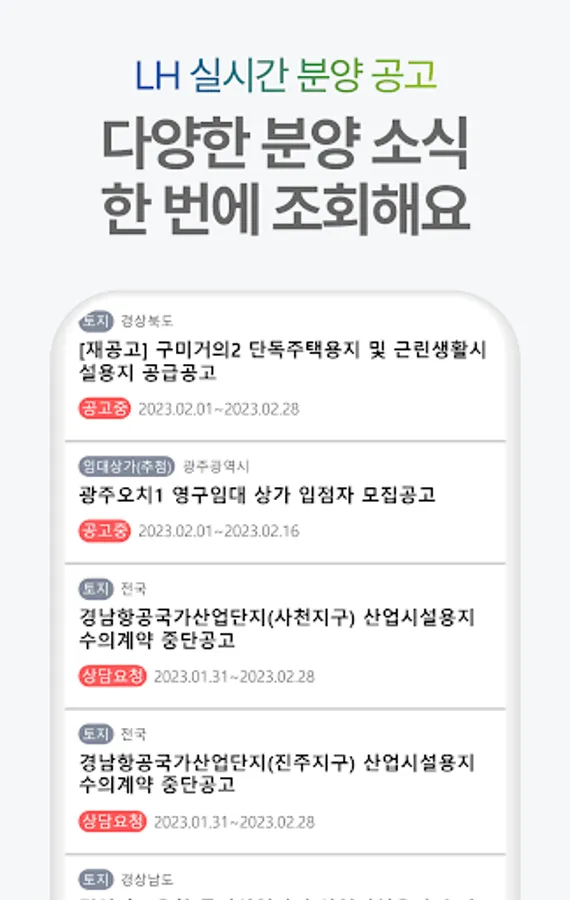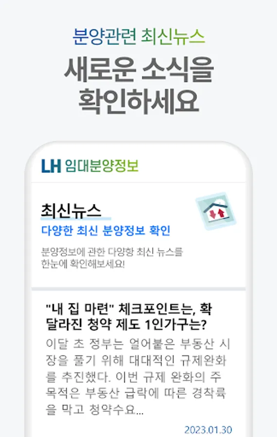 You can easily check the rental sales of LH in 2023 through a nationwide map. Through real-time announcements, find out more meticulously and conveniently information on various sales such as national lease, public lease, and permanent lease! You can even find out the latest news that is updated with pop-up notifications.