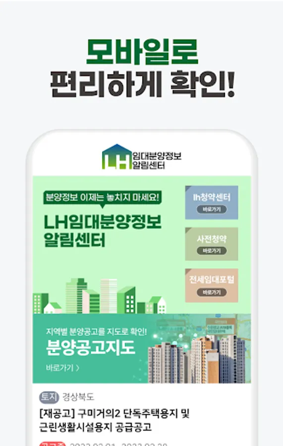 You can check all announcements, such as LH rental sales and public rental in 2023, at a glance through a nationwide map. Easily check real-time sales announcements. In addition to major sales information in the area I was interested in, I will quickly notify you of the latest LH news through pop-up notifications!