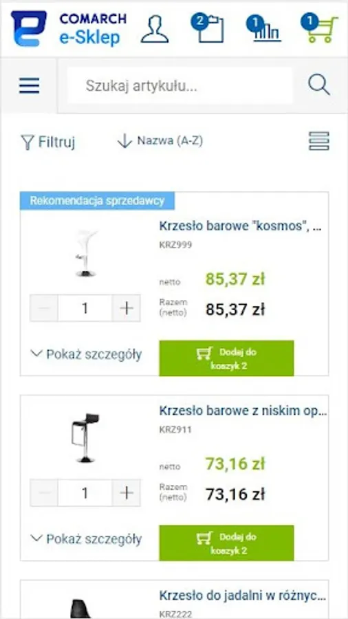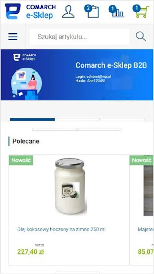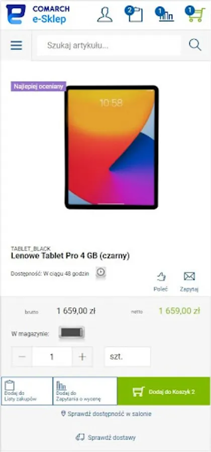 The Comarch e-Shop Mobile application has been prepared to make quick online purchases in a convenient way in the B2B model. Thanks to our original demo store, you will see how to present the assortment for business customers. Find goods using a text or voice search engine, add them to the basket in bulk quantities, check delivery times and availability, choose the appropriate delivery and payment methods. In the application, it is possible to access the Customer Zone, which allows you to check the stage of the order, complaint or search for documents.