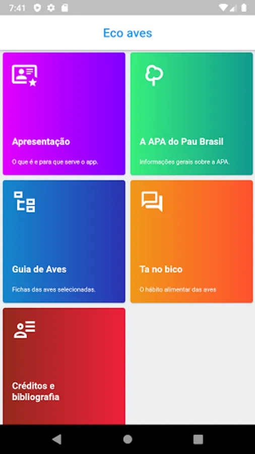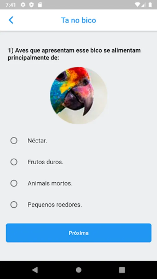 In this application we can also find a Quiz with questions related to the study of birds and ecological concepts, in order to enrich the ecology classes and make learning more dynamic with the insertion of active methodologies, stimulating the protagonism of the student.