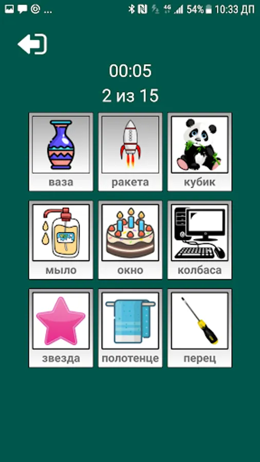 6. "Find the picture with the last word" - words randomly appear on the screen. Then a table with words appears. You need to find the picture corresponding to the last word that appeared on the screen.