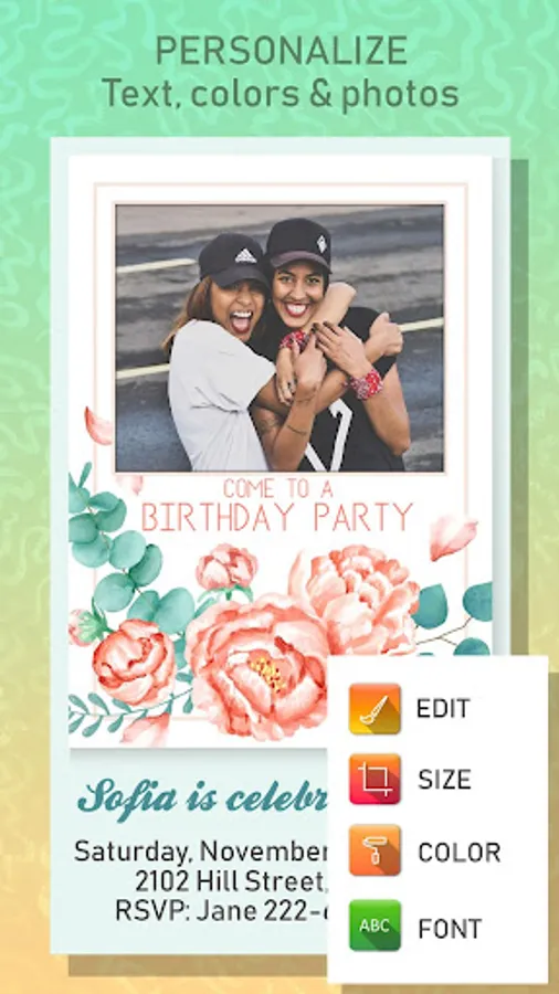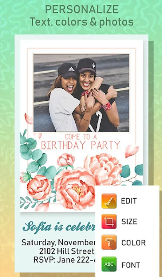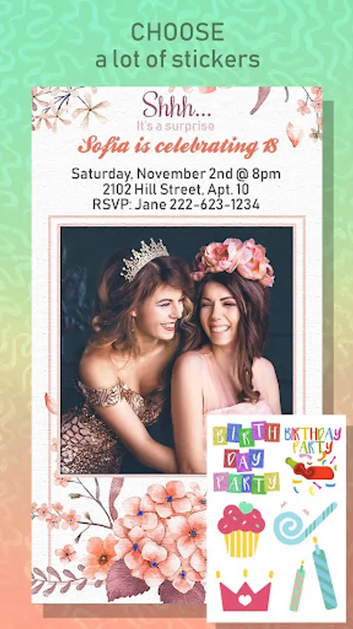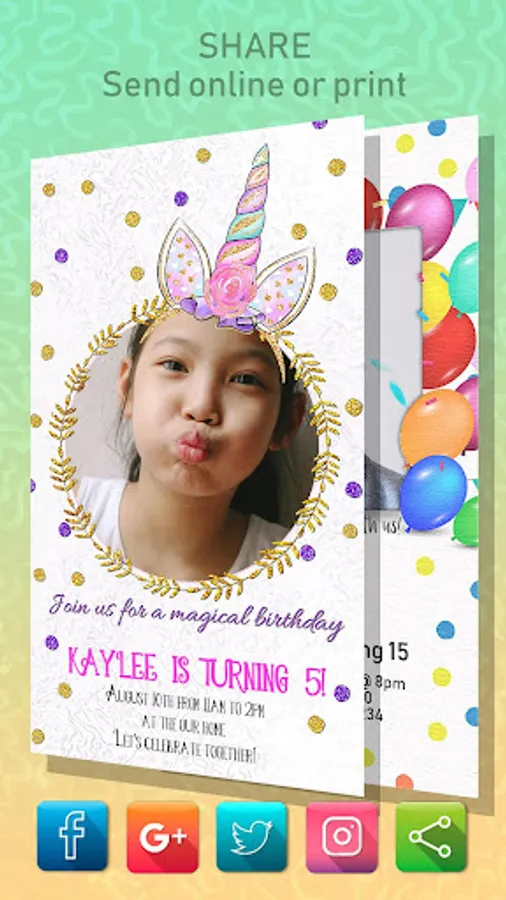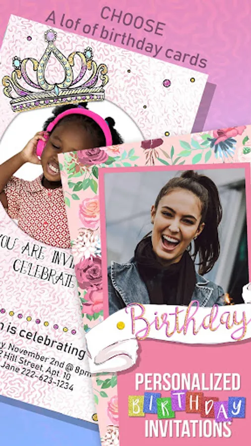 Create the most precious memories with your loved ones! If you are a type of person who always wants to do something original and different, this awesome happy bday photo editor app is the best choice for you. Design your own custom birthday card with photo upload in a couple of simple steps and send out most amazing free evites for your party. Create something truly amazing and special for all your friends!