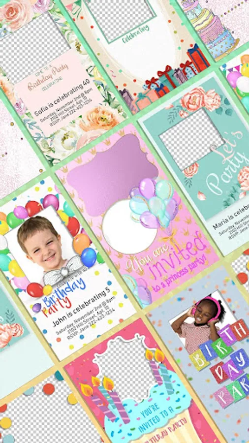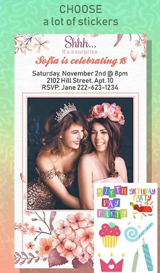 It is so easy and simple to make the perfect invitation card for birthday party with photo from your own gallery. Adorn your favorite picture with cute cakes, colorful balloons, candles, glitter and so much more! Make unique and printable bday invitation cards for adults with photos from your gallery, customized text, picture decorations and more.