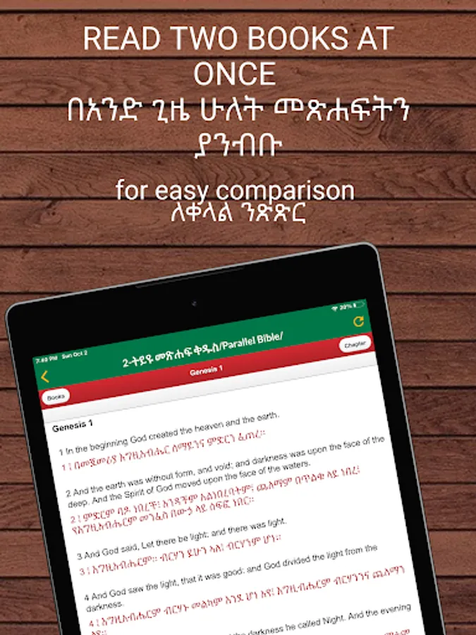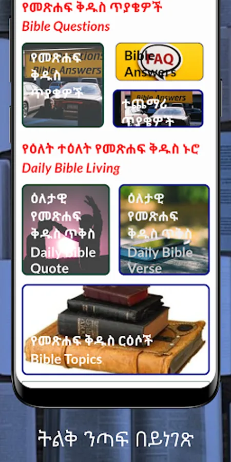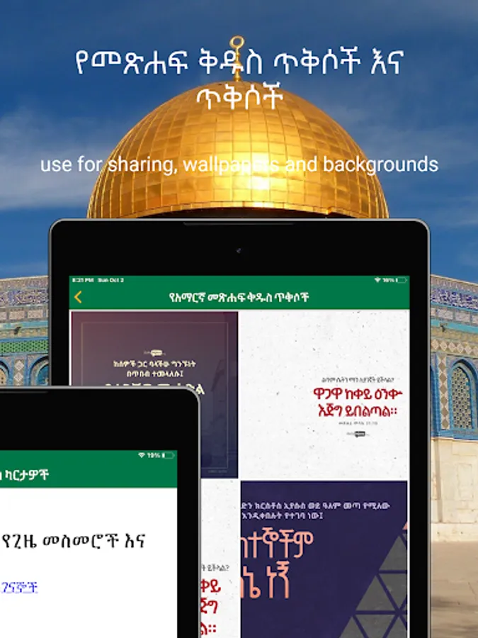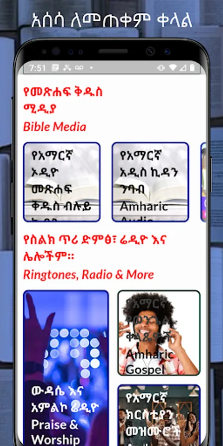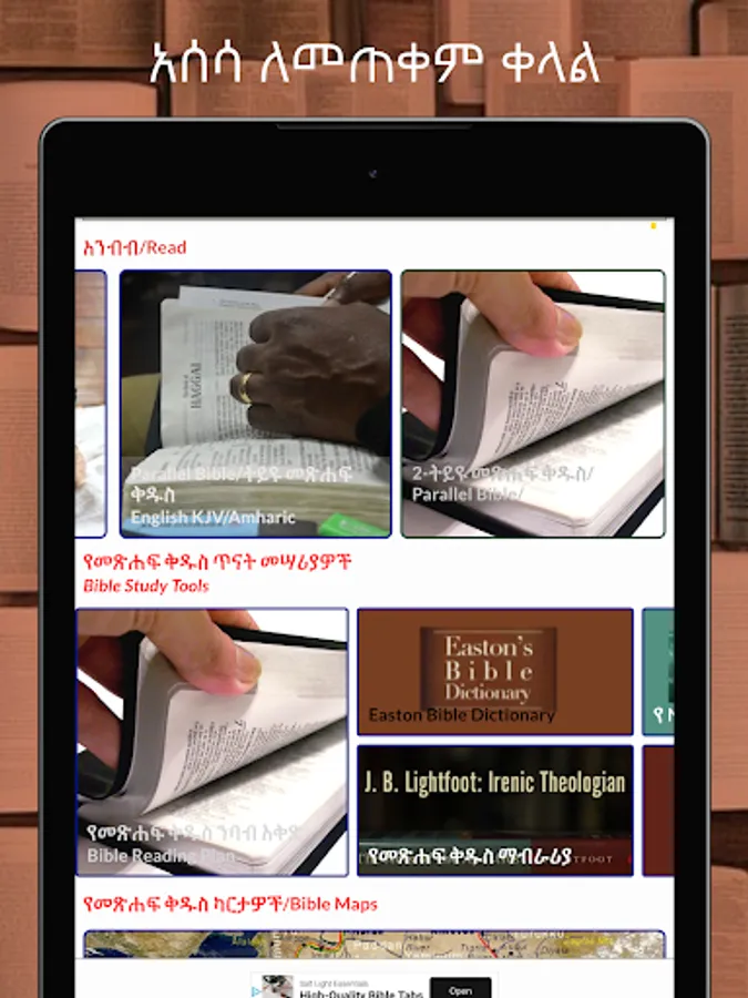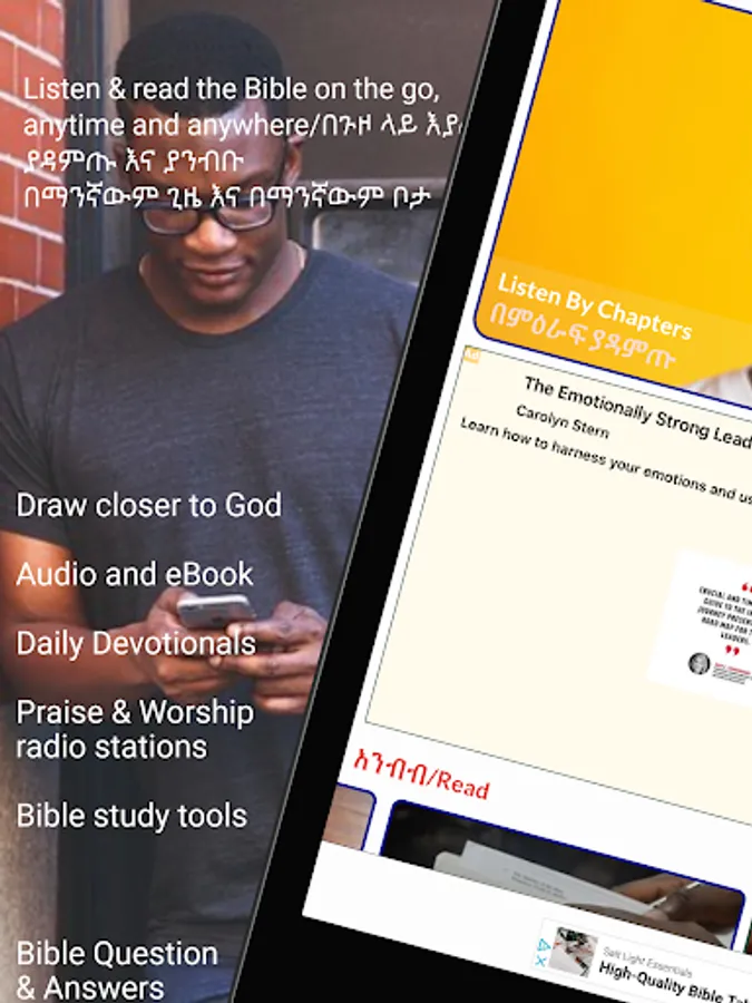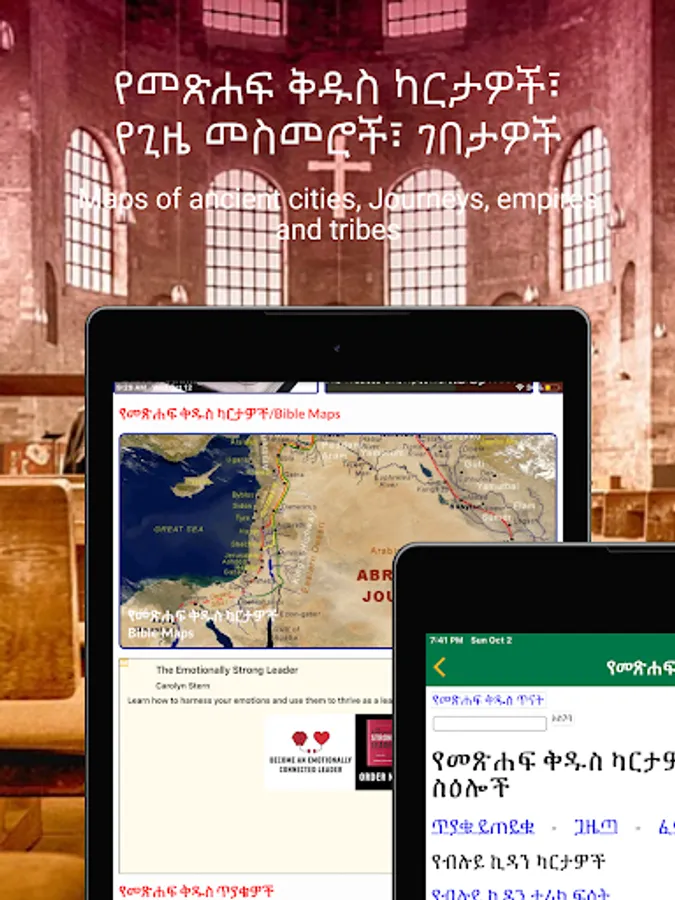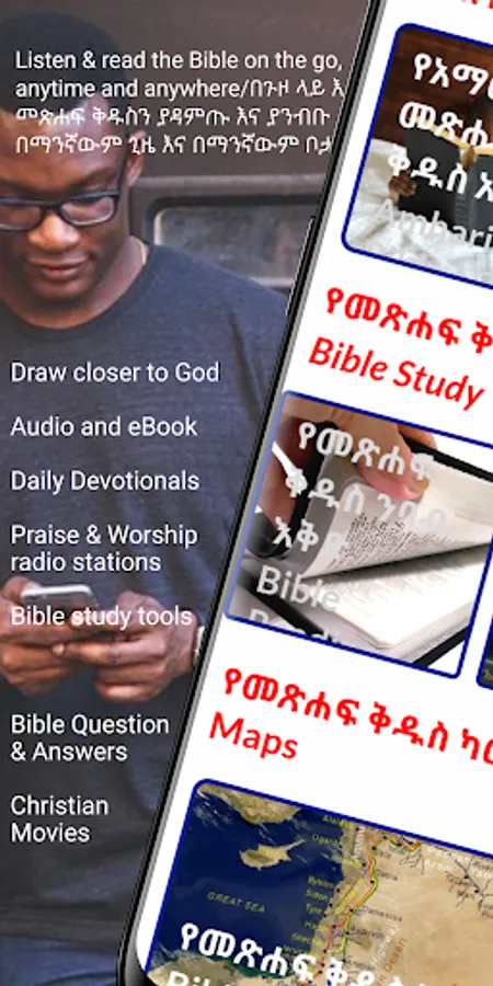 The app includes the complete Amharic Bible audio and ebook. A dramatic reading audio and the ebook Study Bible - Old and New Testament plus many free features.