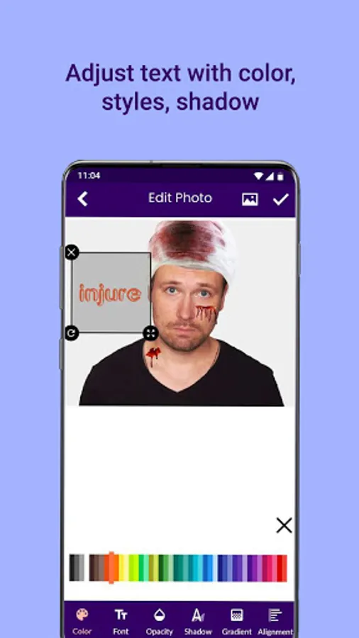 Step 9: Employ simple touch gestures to adjust the size and orientation of the text effects in the Fight Injury Face Photo maker and Editor photo montage.