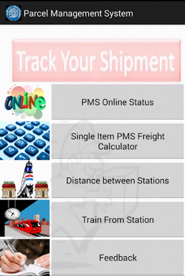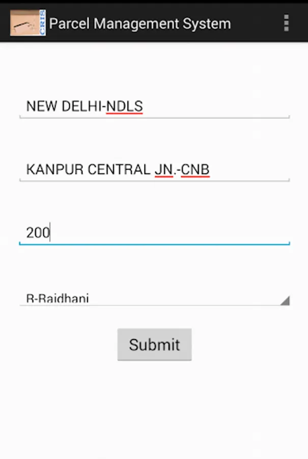 Indian Railway Parcel offices are computerized through Parcel Management System, to facilitate customers, Android application developed for knowing current status of parcel,calculate approx fare based on weight and scale of train, trains at station and trains between stations